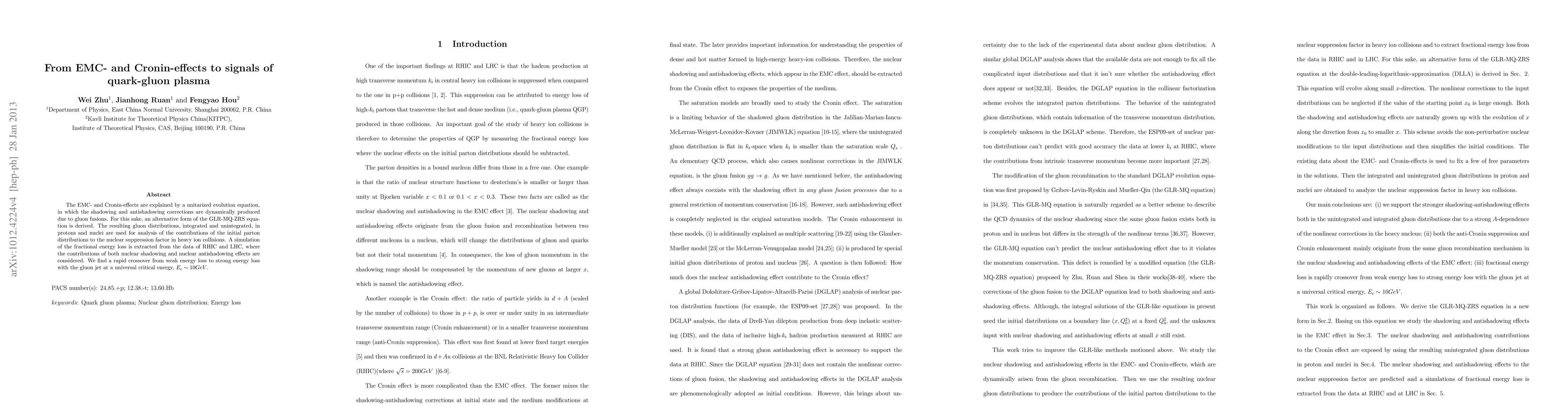 The EMC- and Cronin-effects are explained by a unitarized evolution equation, where the shadowing and antishadowing corrections are dynamically produced by gluon fusions. For this sake, an alternative form of the GLR-MQ-ZRS equation is derived. The resulting integrated and unintegrated gluon distributions in proton and nuclei are used to analyze the contributions of the initial parton distributions to the nuclear suppression factor in heavy ion collisions. A simulation of the fractional energy loss is extracted from the RHIC and LHC data, where the contributions of the nuclear shadowing and antishadowing effects are considered. We find a rapid crossover from week energy loss to strong energy loss at a universal critical energy of gluon jet $E_c\sim 10 GeV$.