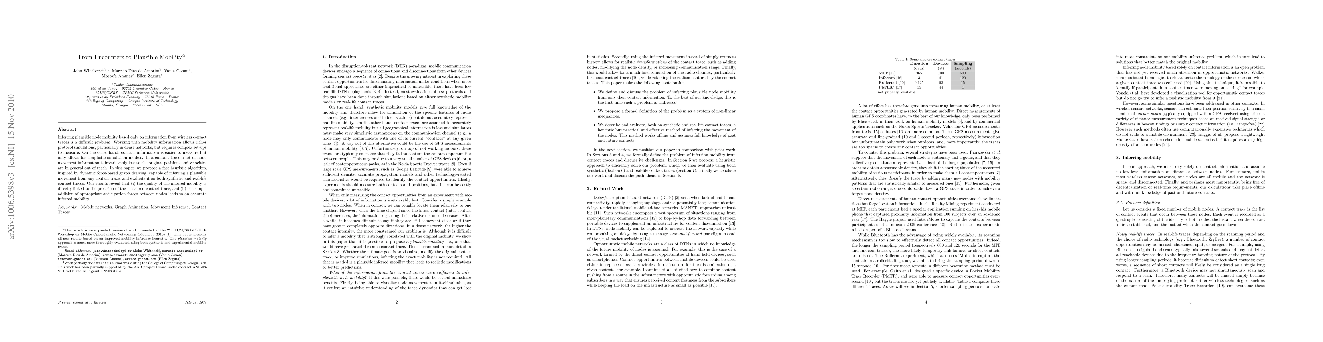 Inferring plausible node mobility based only on information from wireless contact traces is a difficult problem. Working with mobility information allows richer protocol simulations, particularly in dense networks, but requires complex set-ups to measure. On the other hand, contact information is easier to measure but only allows for simplistic simulation models. In a contact trace a lot of node movement information is irretrievably lost so the original positions and velocities are in general out of reach. In this paper, we propose a fast heuristic algorithm, inspired by dynamic force-based graph drawing, capable of inferring a plausible movement from any contact trace, and evaluate it on both synthetic and real-life contact traces. Our results reveal that (i) the quality of the inferred mobility is directly linked to the precision of the measured contact trace, and (ii) the simple addition of appropriate anticipation forces between nodes leads to an accurate inferred mobility.