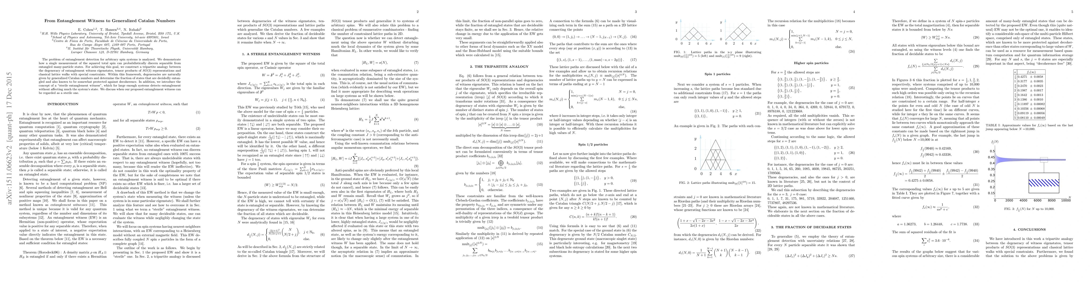 The paper presents a novel entanglement witness based on the squared total spin operator, linking entanglement detection to generalized Catalan numbers and classical lattice walks.