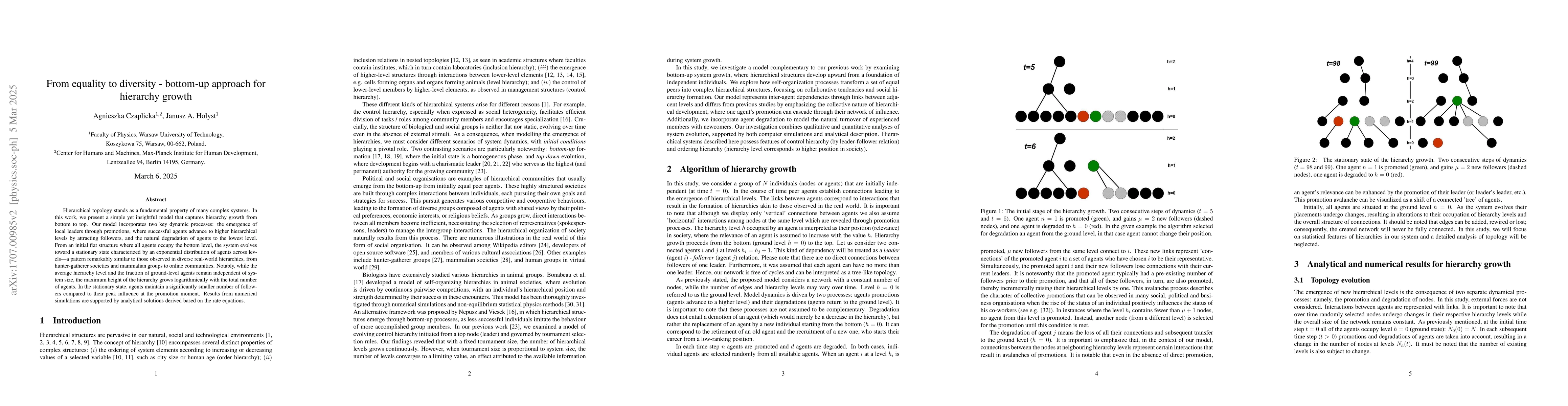 The hierarchical topology is a common property of many complex systems. Here we introduce a simple but generic model of hierarchy growth from the bottom to the top. Therein, two dynamical processes are accounted for: agent's promotions to next hierarchy levels when local speakers are elected and followed by other agents and agent's degradations to the lowest hierarchy. Following the initial stage when all agents are at the bottom level in the course of time the system approaches a stationary state where new hierarchies no longer emerge and the distribution of agents at different levels is exponential. In the stationary state the average hierarchy level and the fraction of agents at the lowest level are independent from the system size however the height of hierarchy, i.e. maximal number of observed hierarchy levels grows logarithmically along the total number of agents. The average number of followers of an agent in the stationary state is much smaller than the number of followers he possessed at the promotion moment. Results from numerical simulations are confirmed by an analytical treatment based on the rate equation.