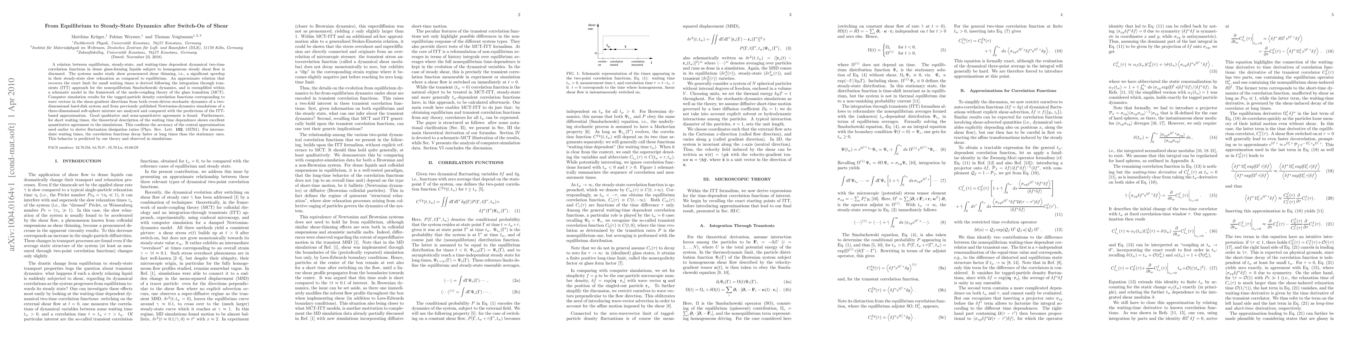 A relation between equilibrium, steady-state, and waiting-time dependent dynamical two-time correlation functions in dense glass-forming liquids subject to homogeneous steady shear flow is discussed. The systems under study show pronounced shear thinning, i.e., a significant speedup in their steady-state slow relaxation as compared to equilibrium. An approximate relation that recovers the exact limit for small waiting times is derived following the integration through transients (ITT) approach for the nonequilibrium Smoluchowski dynamics, and is exemplified within a schematic model in the framework of the mode-coupling theory of the glass transition (MCT). Computer simulation results for the tagged-particle density correlation functions corresponding to wave vectors in the shear-gradient directions from both event-driven stochastic dynamics of a two-dimensional hard-disk system and from previously published Newtonian-dynamics simulations of a three-dimensional soft-sphere mixture are analyzed and compared with the predictions of the ITT-based approximation. Good qualitative and semi-quantitative agreement is found. Furthermore, for short waiting times, the theoretical description of the waiting time dependence shows excellent quantitative agreement to the simulations. This confirms the accuracy of the central approximation used earlier to derive fluctuation dissipation ratios (Phys. Rev. Lett. 102, 135701). For intermediate waiting times, the correlation functions decay faster at long times than the stationary ones. This behavior is predicted by our theory and observed in simulations.