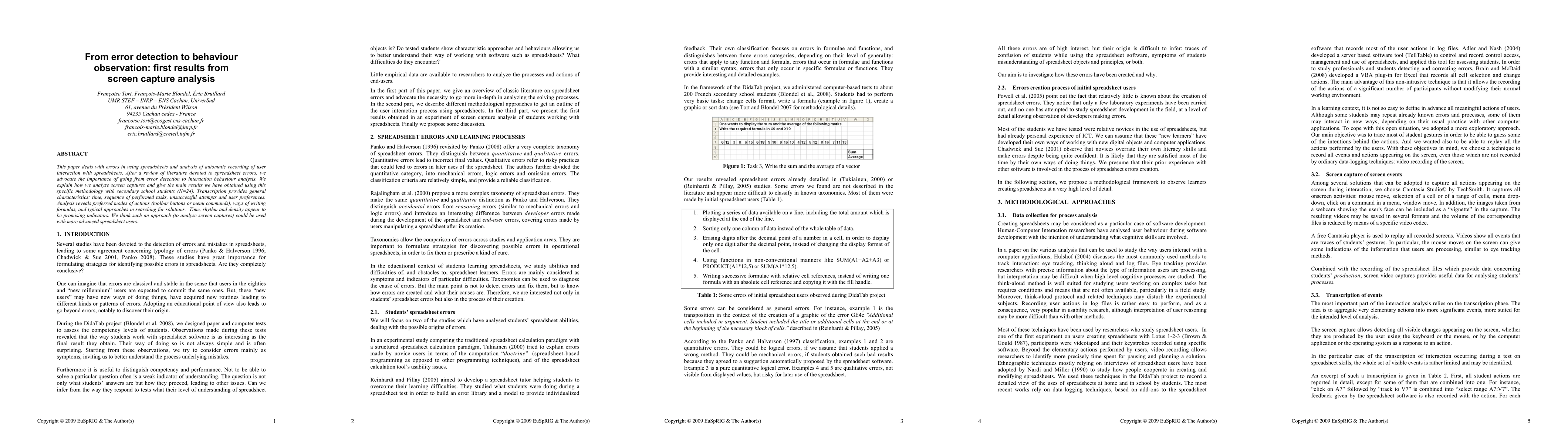 This paper deals with errors in using spreadsheets and analysis of automatic recording of user interaction with spreadsheets. After a review of literature devoted to spreadsheet errors, we advocate the importance of going from error detection to interaction behaviour analysis. We explain how we analyze screen captures and give the main results we have obtained using this specific methodology with secondary school students (N=24). Transcription provides general characteristics: time, sequence of performed tasks, unsuccessful attempts and user preferences. Analysis reveals preferred modes of actions (toolbar buttons or menu commands), ways of writing formulas, and typical approaches in searching for solutions. Time, rhythm and density appear to be promising indicators. We think such an approach (to analyze screen captures) could be used with more advanced spreadsheet users.