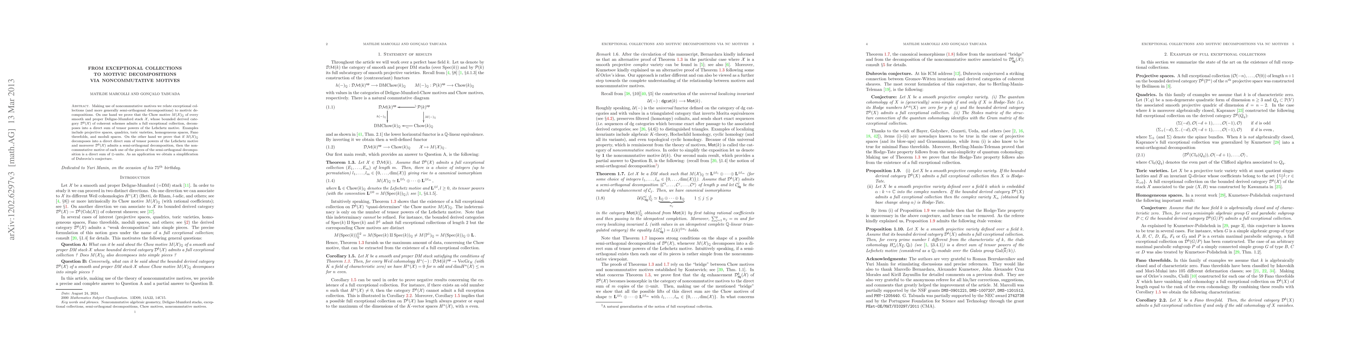 This paper uses noncommutative motives to link exceptional collections in derived categories to motivic decompositions. It shows that the Chow motive of smooth proper Deligne-Mumford stacks with full exceptional collections decomposes into tensor powers of the Lefschetz motive, and conversely, if such decompositions exist, the noncommutative motive of semi-orthogonal components simplifies.