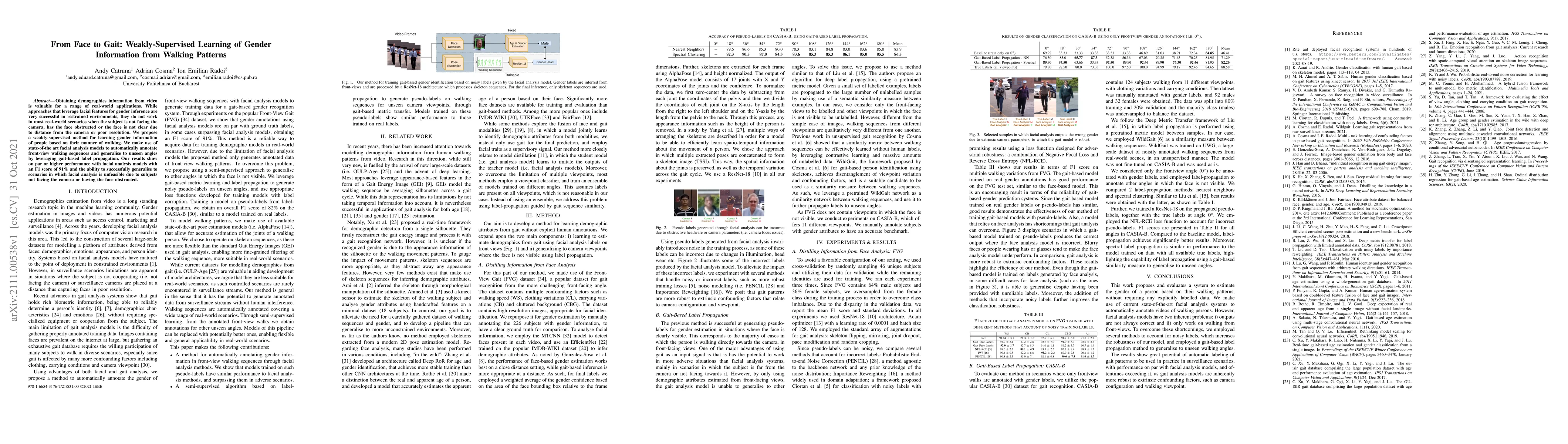 Obtaining demographics information from video is valuable for a range of real-world applications. While approaches that leverage facial features for gender inference are very successful in restrained environments, they do not work in most real-world scenarios when the subject is not facing the camera, has the face obstructed or the face is not clear due to distance from the camera or poor resolution. We propose a weakly-supervised method for learning gender information of people based on their manner of walking. We make use of state-of-the art facial analysis models to automatically annotate front-view walking sequences and generalise to unseen angles by leveraging gait-based label propagation. Our results show on par or higher performance with facial analysis models with an F1 score of 91% and the ability to successfully generalise to scenarios in which facial analysis is unfeasible due to subjects not facing the camera or having the face obstructed.