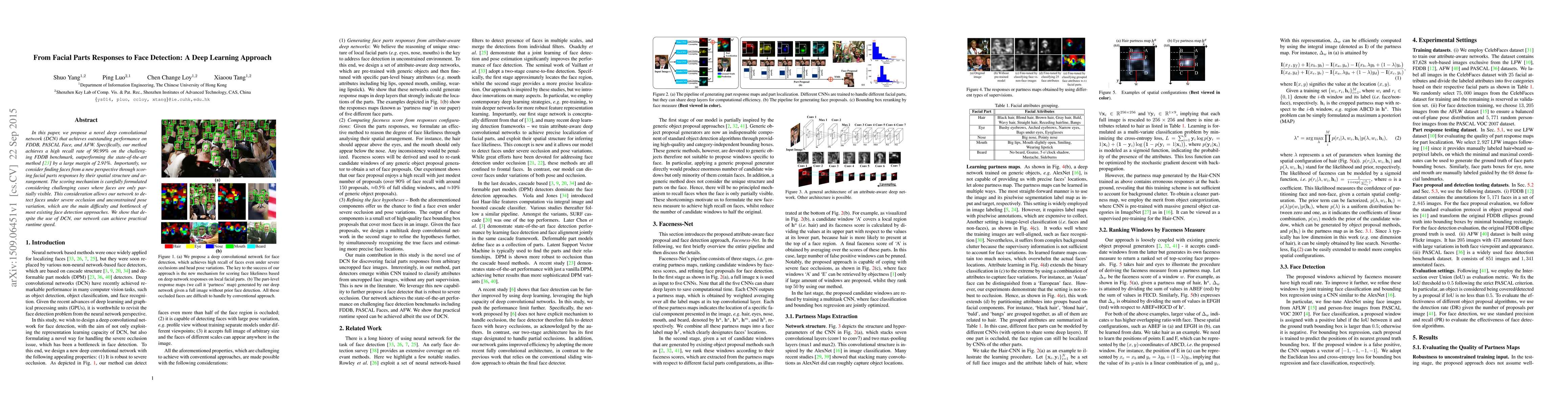 In this paper, we propose a novel deep convolutional network (DCN) that achieves outstanding performance on FDDB, PASCAL Face, and AFW. Specifically, our method achieves a high recall rate of 90.99% on the challenging FDDB benchmark, outperforming the state-of-the-art method by a large margin of 2.91%. Importantly, we consider finding faces from a new perspective through scoring facial parts responses by their spatial structure and arrangement. The scoring mechanism is carefully formulated considering challenging cases where faces are only partially visible. This consideration allows our network to detect faces under severe occlusion and unconstrained pose variation, which are the main difficulty and bottleneck of most existing face detection approaches. We show that despite the use of DCN, our network can achieve practical runtime speed.