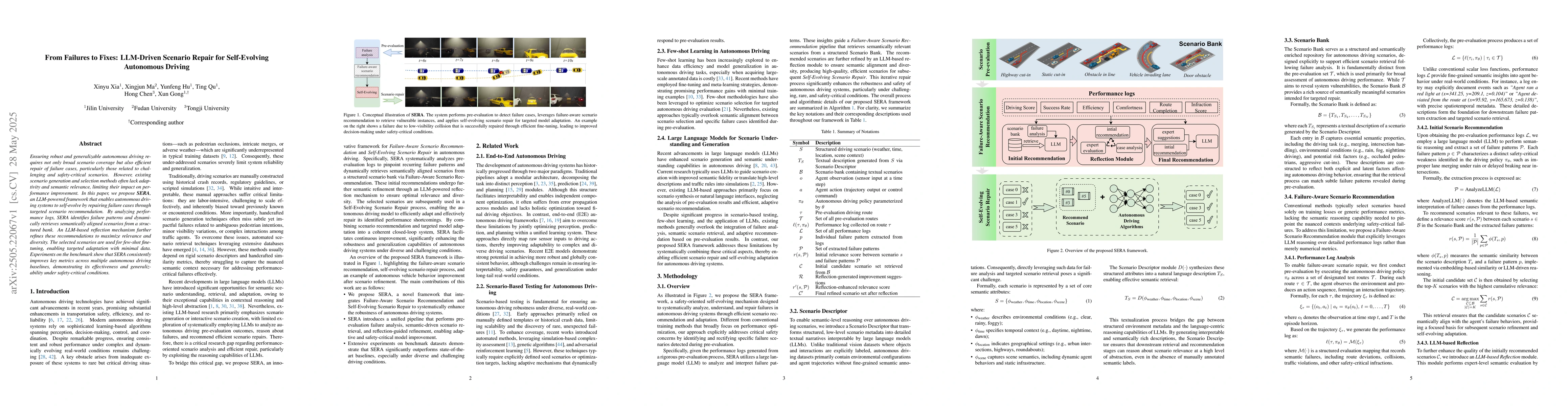 A new framework called SERA uses a large language model to help self-driving cars fix problems by suggesting relevant scenarios for fine-tuning, improving performance and safety.