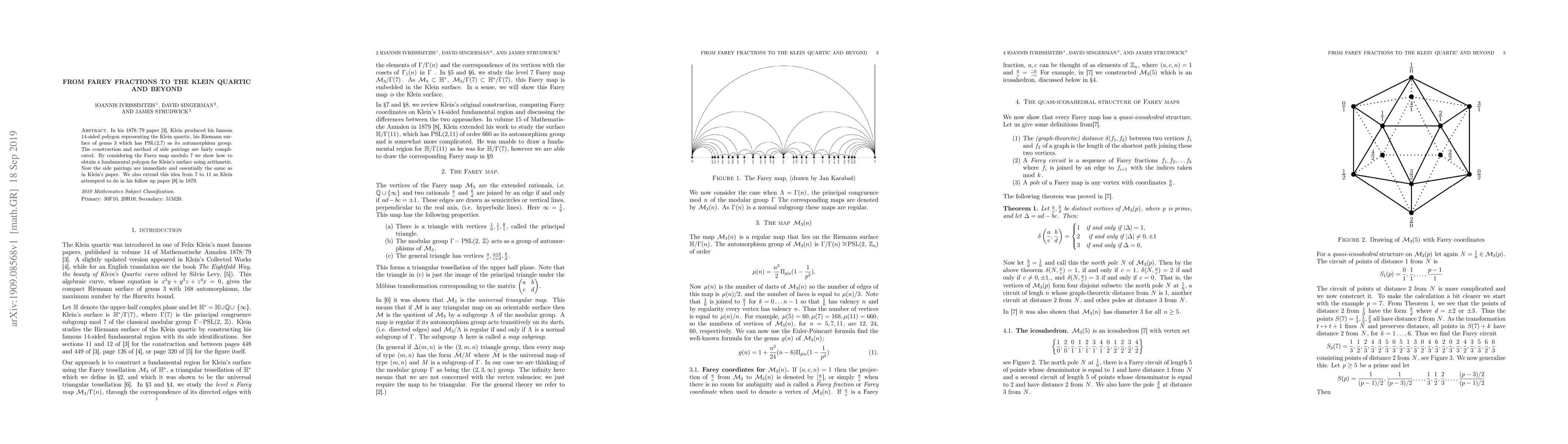 This paper explores the relationship between Farey fractions and the Klein quartic, a genus 3 Riemann surface with PSL(2,7) as its automorphism group. It demonstrates the construction of a fundamental polygon for the Klein quartic using arithmetic methods based on the Farey map modulo 7, simplifying the side pairings. The paper further extends these findings to the case of 11, mirroring Klein's subsequent attempts.