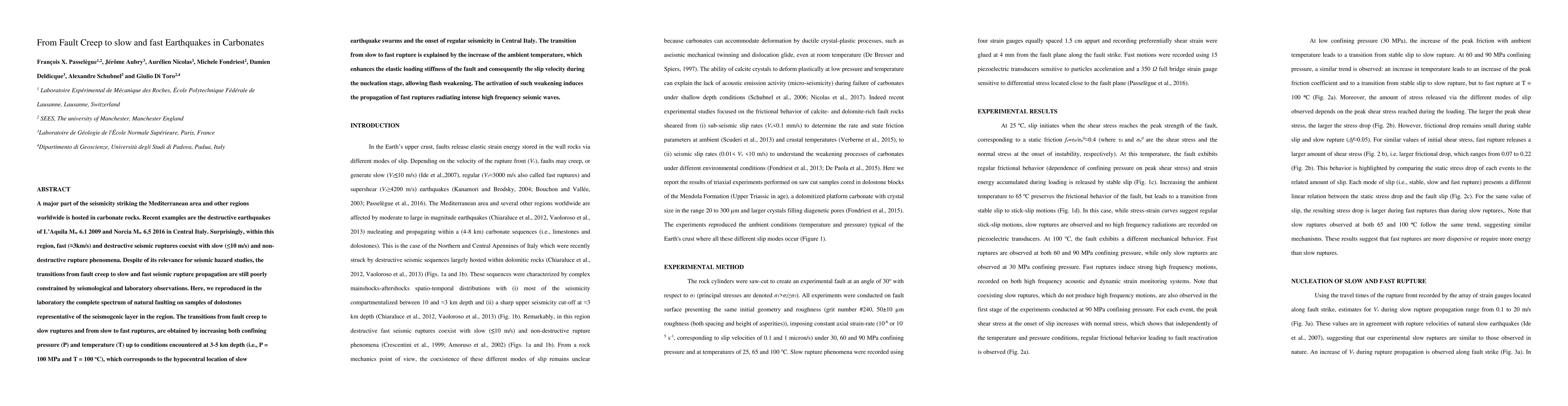 This study investigates the seismic behavior of carbonate rocks in the Mediterranean region, focusing on the transitions from fault creep to slow and fast seismic ruptures. Laboratory experiments on dolostones simulate natural faulting conditions, revealing that increased pressure and temperature promote the shift from slow to fast ruptures, explained by enhanced elastic loading and flash weakening, which generates intense high-frequency seismic waves.