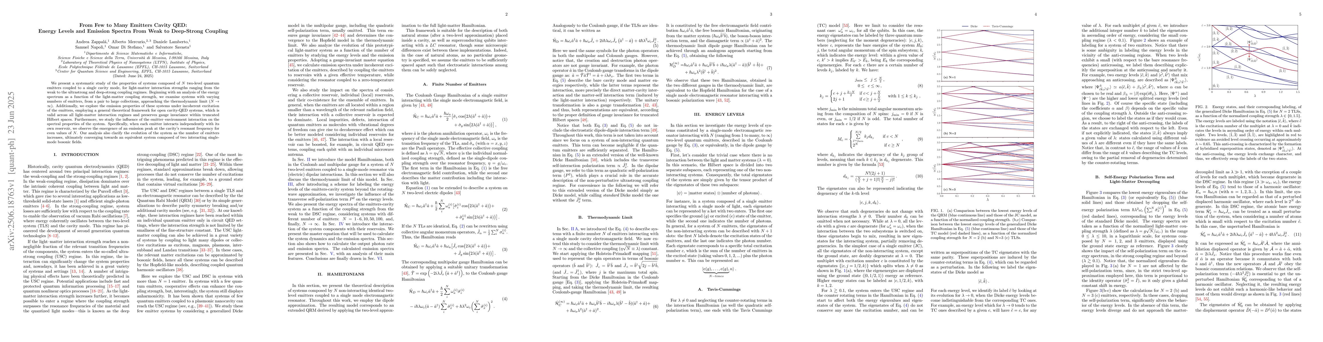This study explores how the properties of systems with N two-level quantum emitters coupled to a single cavity mode change as light-matter interaction strength varies from weak to deep-strong coupling. The research examines energy spectra and emission properties for varying emitter numbers, from pairs to large collections, using a theoretical framework valid across all coupling regimes. Key findings include the emergence of an emission peak at the cavity's resonant frequency for even N and the system's convergence towards two interacting single-mode bosonic fields as N increases.