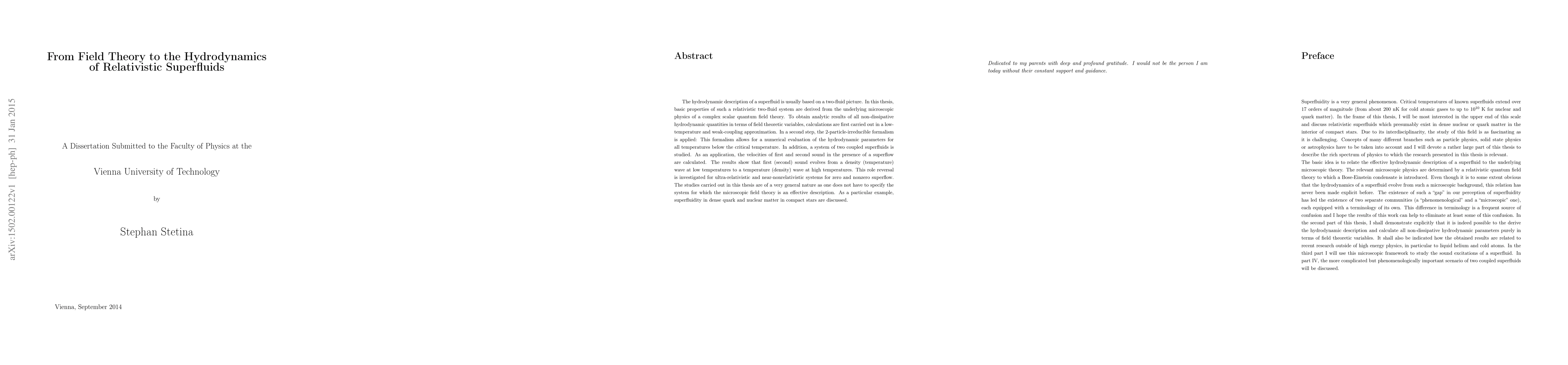 This thesis derives hydrodynamic properties of relativistic superfluids from complex scalar quantum field theory, employing low-temperature approximations and the 2-particle-irreducible formalism. It investigates the transition of first and second sound velocities in superfluids, revealing a role reversal from density to temperature waves with temperature changes.