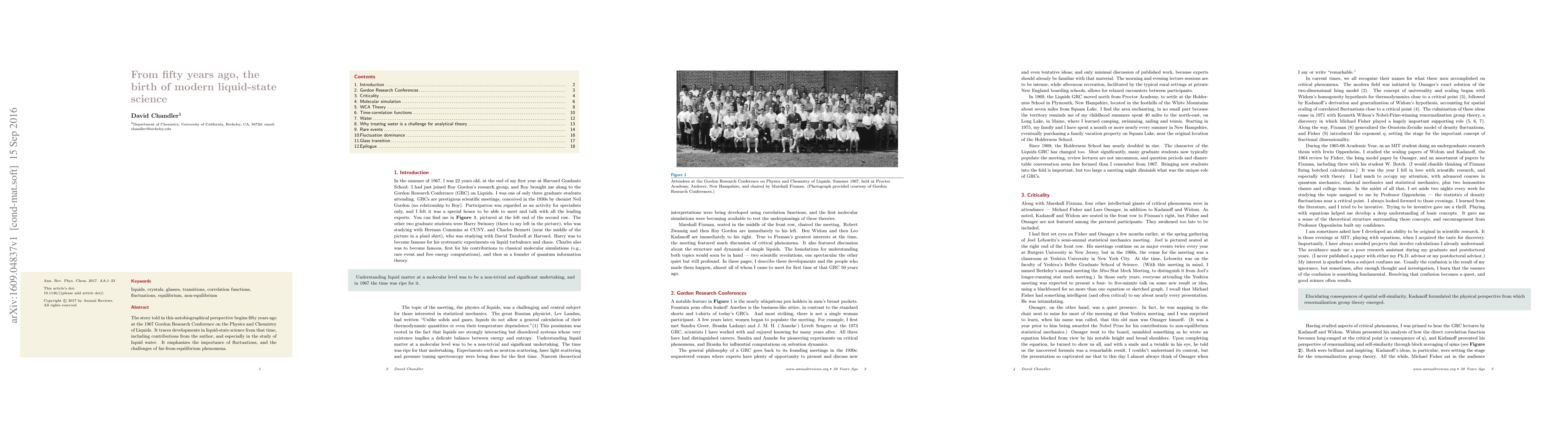 The story told in this autobiographical perspective begins fifty years ago at the 1967 Gordon Research Conference on the Physics and Chemistry of Liquids. It traces developments in liquid-state science from that time, including contributions from the author, and especially in the study of liquid water. It emphasizes the importance of fluctuations, and the challenges of far-from-equilibrium phenomena.