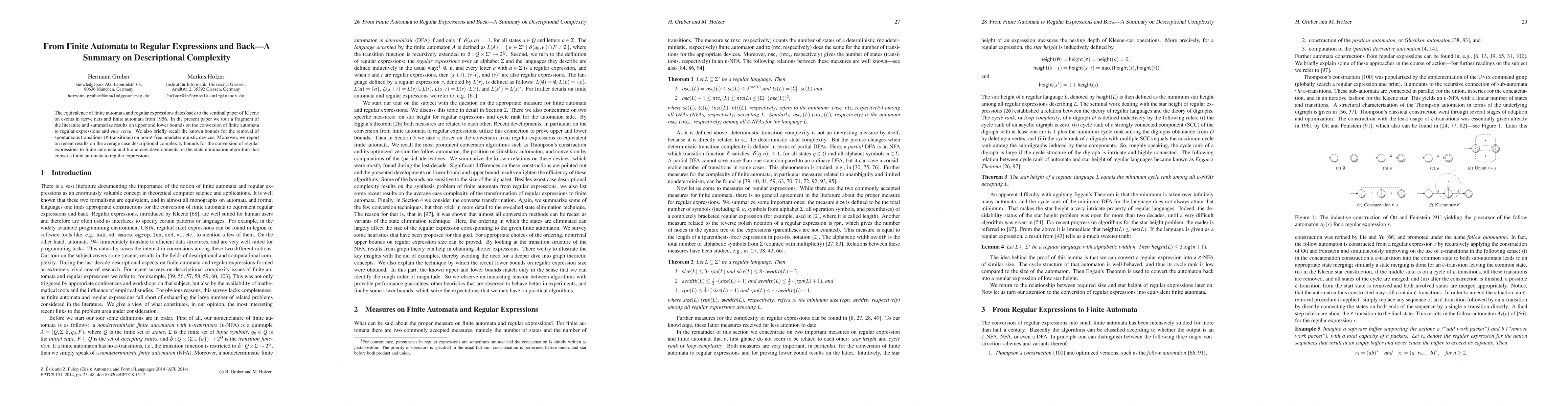 This paper reviews the descriptional complexity of converting finite automata to regular expressions and vice versa, summarizing known upper and lower bounds, discussing the removal of spontaneous transitions, and presenting new findings on average case complexity and state elimination algorithms.