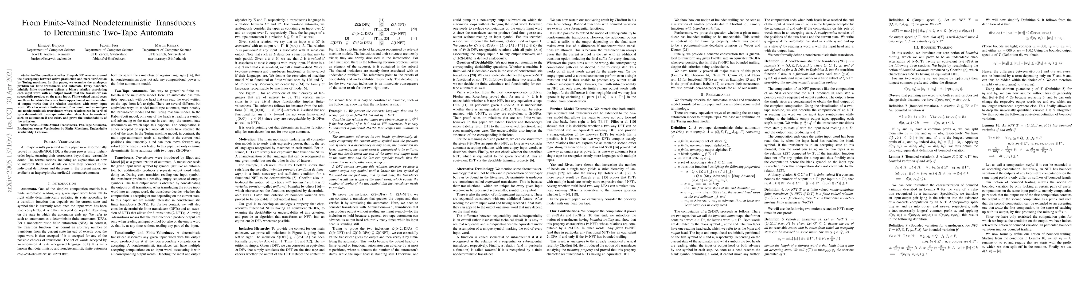 The question whether P equals NP revolves around the discrepancy between active production and mere verification by Turing machines. In this paper, we examine the analogous problem for finite transducers and automata. Every nondeterministic finite transducer defines a binary relation associating each input word with all output words that the transducer can successfully produce on the given input. Finite-valued transducers are those for which there is a finite upper bound on the number of output words that the relation associates with every input word. We characterize finite-valued, functional, and unambiguous nondeterministic transducers whose relations can be verified by a deterministic two-tape automaton, show how to construct such an automaton if one exists, and prove the undecidability of the criterion.