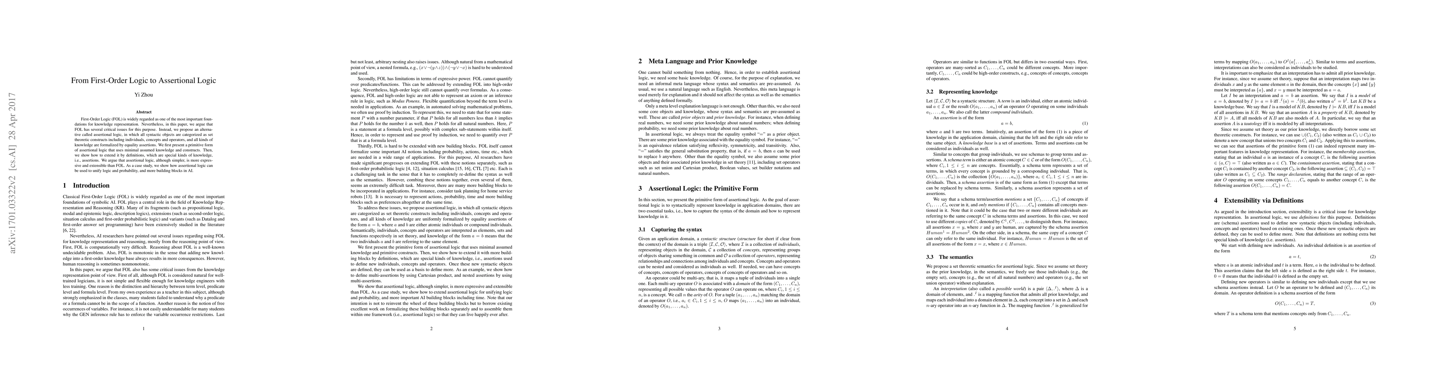 The paper proposes assertional logic as an alternative to First-Order Logic (FOL) for knowledge representation, emphasizing simplicity, flexibility, expressivity, and extensibility. It introduces a primitive form of assertional logic, extends it with definitions, and demonstrates its use in unifying logic and probability.