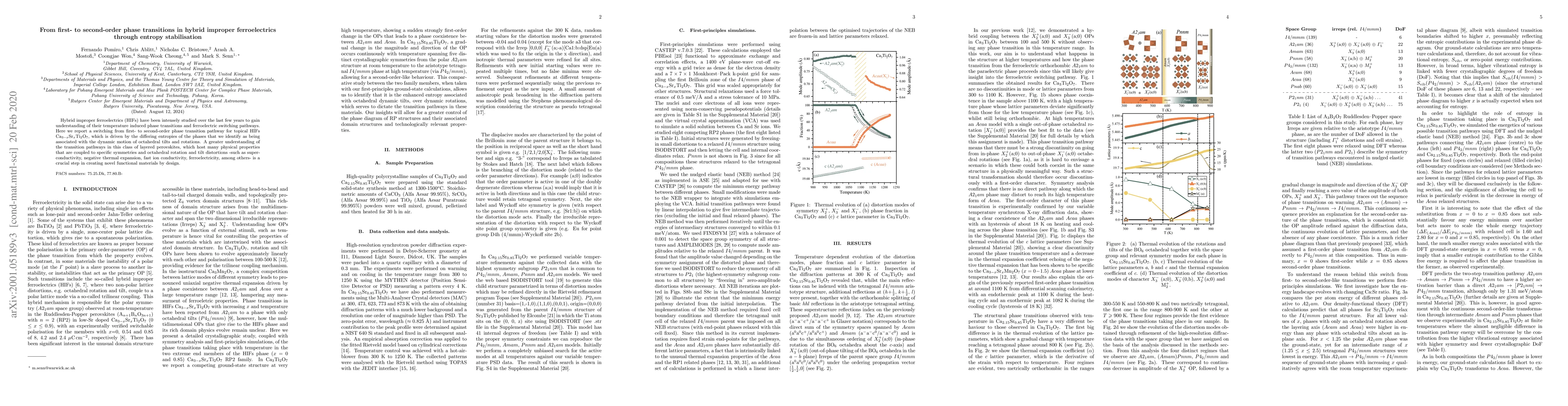 This paper investigates the phase transition pathway in hybrid improper ferroelectrics $Ca_{3-x}Sr_xTi_2O_7$, demonstrating a shift from first- to second-order transitions driven by entropy differences. Understanding these transitions is vital for developing novel functional materials with desired properties.