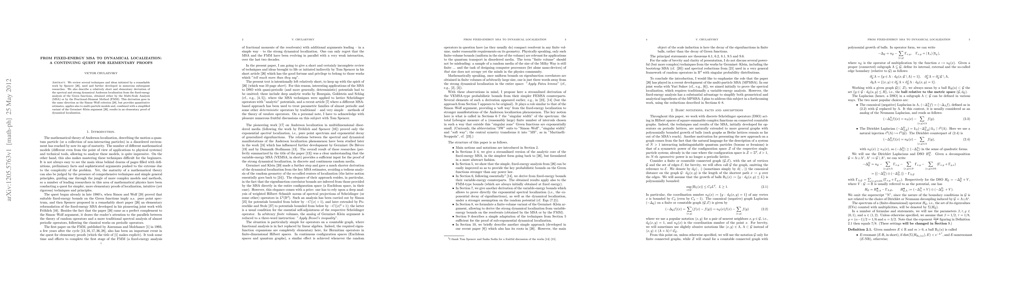 This paper reviews techniques from Spencer's work, focusing on deriving spectral and strong dynamical Anderson localization through fixed-energy analysis of Green functions using Multi-Scale Analysis or Fractional-Moment Method. It provides an elementary proof of dynamical localization, combining these methods with a simplified GermINET-Klein argument.