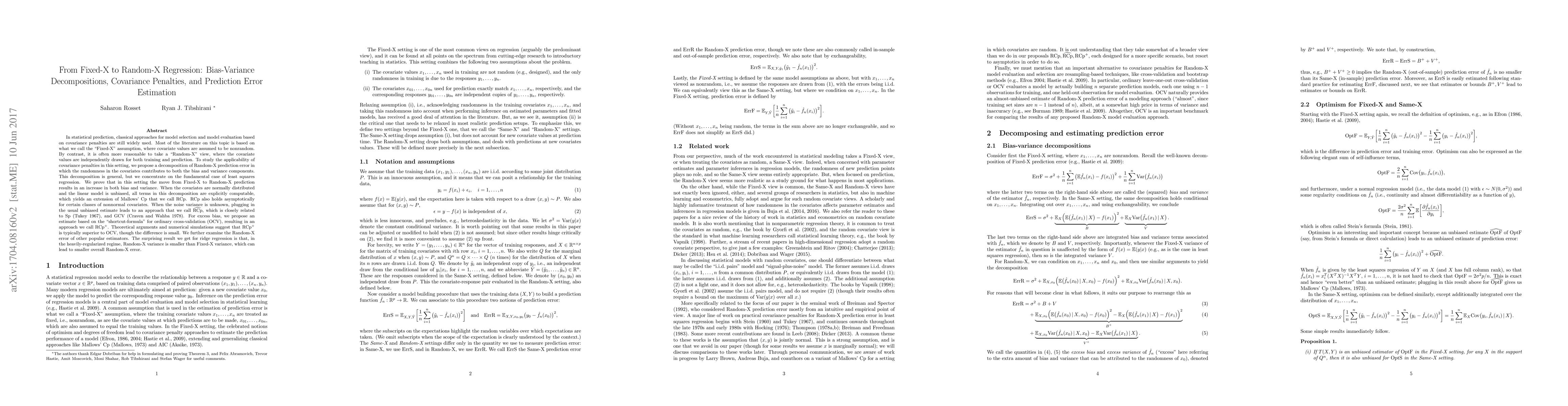 This paper explores the transition from "Fixed-X" to "Random-X" regression, proposing a bias-variance decomposition for Random-X prediction error. It introduces $RCp$ and $\hat{RCp}$ for model evaluation, showing that Random-X variance can be smaller than Fixed-X variance in ridge regression, especially under heavy regularization.