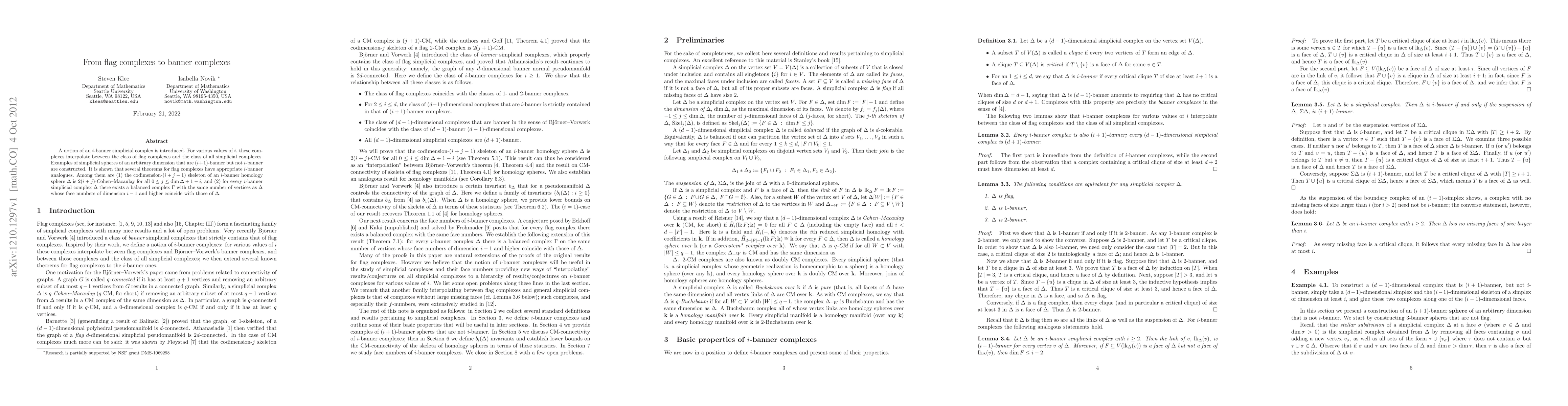 A notion of an $i$-banner simplicial complex is introduced. For various values of $i$, these complexes interpolate between the class of flag complexes and the class of all simplicial complexes. Examples of simplicial spheres of an arbitrary dimension that are $(i+1)$-banner but not $i$-banner are constructed. It is shown that several theorems for flag complexes have appropriate $i$-banner analogues. Among them are (1) the codimension-$(i+j-1)$ skeleton of an $i$-banner homology sphere $\Delta$ is $2(i+j)$-Cohen--Macaulay for all $0\leq j\leq \dim\Delta+1-i$, and (2) for every $i$-banner simplicial complex $\Delta$ there exists a balanced complex $\Gamma$ with the same number of vertices as $\Delta$ whose face numbers of dimension $i-1$ and higher coincide with those of $\Delta$.