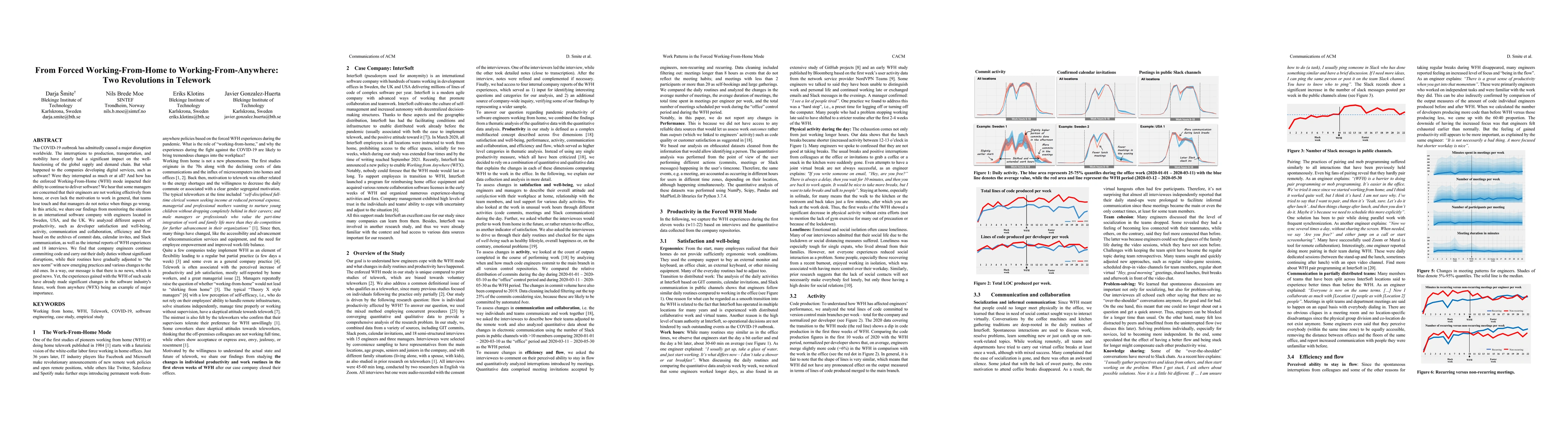 The COVID-19 outbreak has admittedly caused a major disruption worldwide. The interruptions to production, transportation, and mobility have clearly had a significant impact on the well-functioning of the global supply and demand chain. But what happened to the companies developing digital services, such as software. Were they interrupted as much or at all? And how has the enforced Working-From-Home mode impacted their ability to continue to deliver software? We hear that some managers are concerned that their engineers are not working effectively from home, or even lack the motivation to work in general, that teams lose touch and that managers do not notice when things go wrong. In this article, we share our findings from monitoring the situation in an international software company with engineers located in Sweden, USA, and the UK. We analyzed different aspects of productivity, such as developer satisfaction and well-being, activity, communication and collaboration, efficiency and flow based on the archives of commit data, calendar invites, and Slack communication, as well as the internal reports of WFH experiences and 18 interviews. We find that company engineers continue committing code and carry out their daily duties without significant disruptions, while their routines have gradually adjusted to the new norm with new emerging practices and various changes to the old ones. In a way, our message is that there is no news, which is good news. Yet, the experiences gained with the WFH of such scale have already made significant changes in the software industry's future, work from anywhere being an example of major importance.