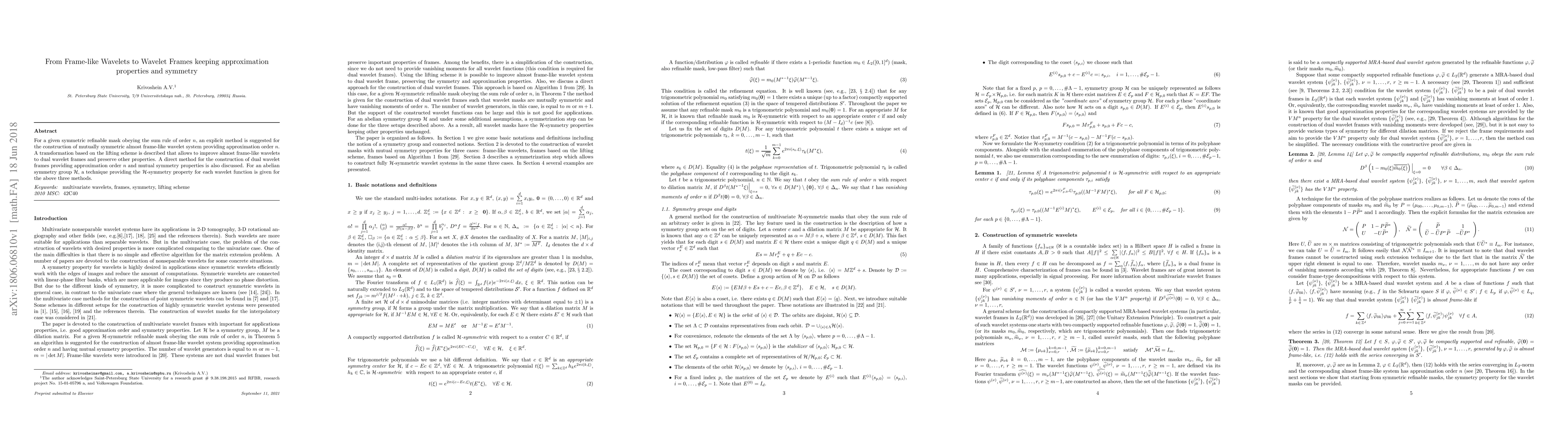 For a given symmetric refinable mask obeying the sum rule of order $n$, an explicit method is suggested for the construction of mutually symmetric almost frame-like wavelet system providing approximation order $n$. A transformation based on the lifting scheme is described that allows to improve almost frame-like wavelets to dual wavelet frames and preserve other properties. A direct method for the construction of dual wavelet frames providing approximation order $n$ and mutual symmetry properties is also discussed. For an abelian symmetry group $H$, a technique providing the $H$-symmetry property for each wavelet function is given for the above three methods.