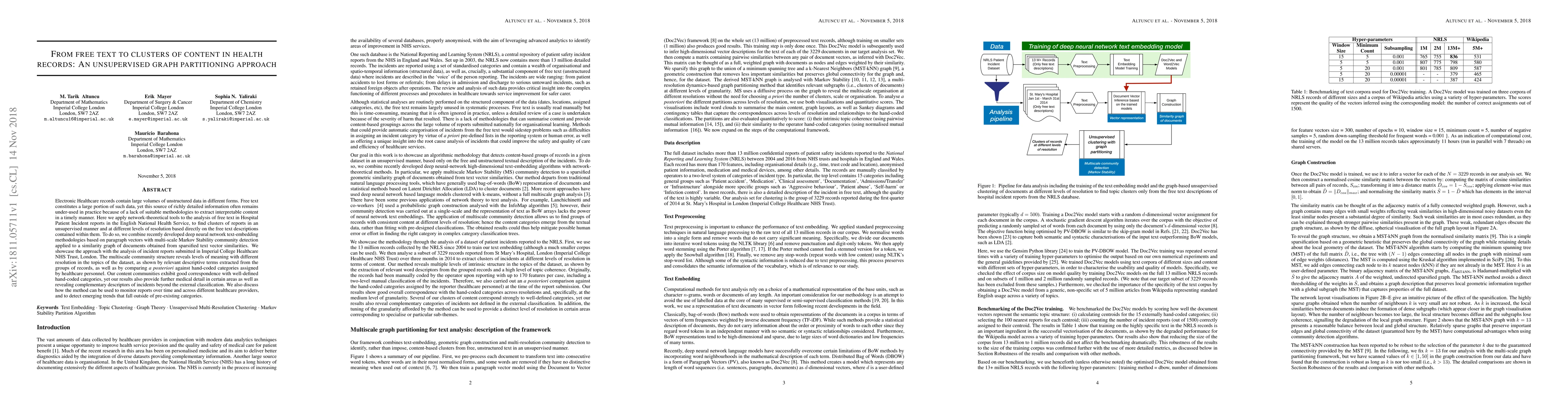 Electronic Healthcare records contain large volumes of unstructured data in different forms. Free text constitutes a large portion of such data, yet this source of richly detailed information often remains under-used in practice because of a lack of suitable methodologies to extract interpretable content in a timely manner. Here we apply network-theoretical tools to the analysis of free text in Hospital Patient Incident reports in the English National Health Service, to find clusters of reports in an unsupervised manner and at different levels of resolution based directly on the free text descriptions contained within them. To do so, we combine recently developed deep neural network text-embedding methodologies based on paragraph vectors with multi-scale Markov Stability community detection applied to a similarity graph of documents obtained from sparsified text vector similarities. We showcase the approach with the analysis of incident reports submitted in Imperial College Healthcare NHS Trust, London. The multiscale community structure reveals levels of meaning with different resolution in the topics of the dataset, as shown by relevant descriptive terms extracted from the groups of records, as well as by comparing a posteriori against hand-coded categories assigned by healthcare personnel. Our content communities exhibit good correspondence with well-defined hand-coded categories, yet our results also provide further medical detail in certain areas as well as revealing complementary descriptors of incidents beyond the external classification. We also discuss how the method can be used to monitor reports over time and across different healthcare providers, and to detect emerging trends that fall outside of pre-existing categories.