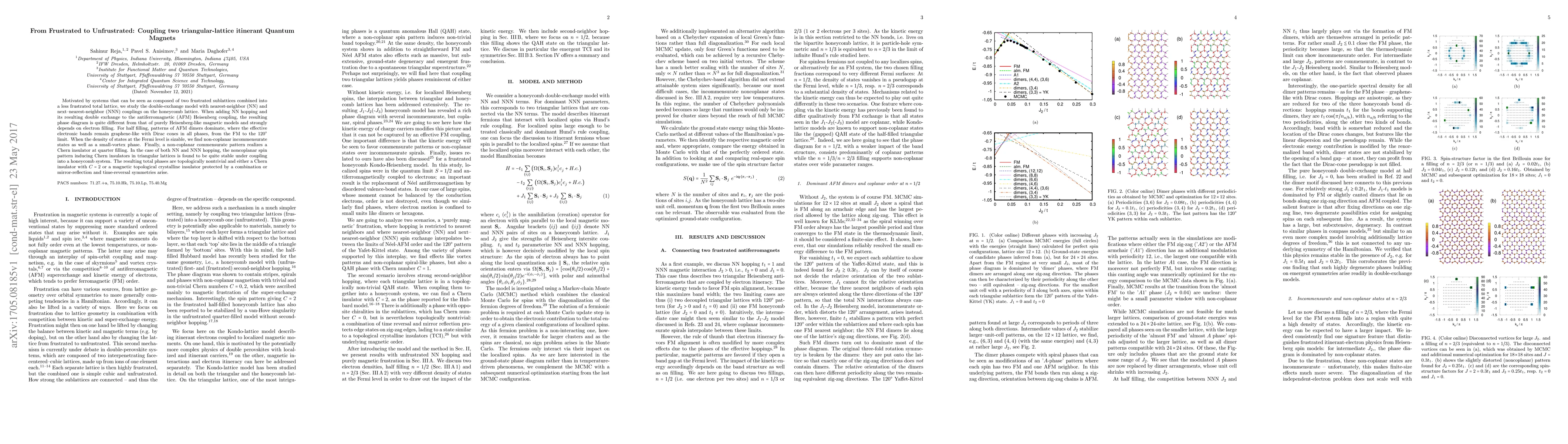 Motivated by systems that can be seen as composed of two frustrated sublattices combined into a less frustrated total lattice, we study the double-exchange model with nearest-neighbor (NN) and next--nearest-neighbor (NNN) couplings on the honeycomb lattice. When adding NN hopping and its resulting double exchange to the antiferromagnetic (AFM) Heisenberg coupling, the resulting phase diagram is quite different from that of purely Heisenberg-like magnetic models and strongly depends on electron filling. For half filling, patterns of AFM dimers dominate, where the effective electronic bands remain graphene-like with Dirac cones in all phases, from the FM to the $120^\circ$ limit. When the density of states at the Fermi level is sizable, we find non-coplanar incommensurate states as well as a small-vortex phase. Finally, a non-coplanar commensurate pattern realizes a Chern insulator at quarter filling. In the case of both NN and NNN hopping, the noncoplanar spin pattern inducing Chern insulators in triangular lattices is found to be quite stable under coupling into a honeycomb system. The resulting total phases are topologically nontrivial and either a Chern insulator with $C=2$ or a magnetic topological crystalline insulator protected by a combination or mirror-reflection and time-reversal symmetries arise.