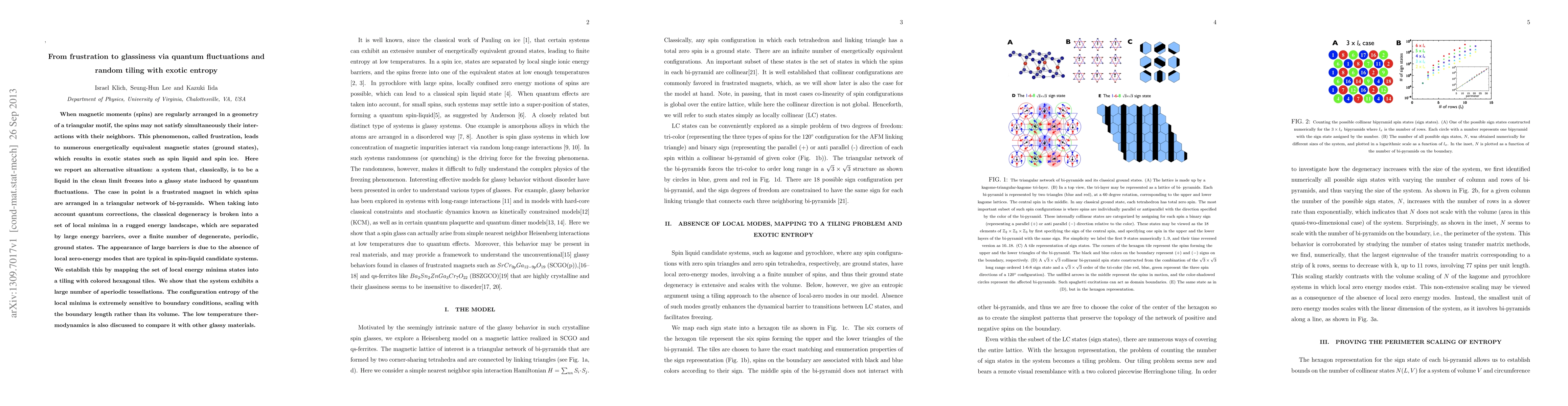 When magnetic moments (spins) are regularly arranged in a geometry of a triangular motif, the spins may not satisfy simultaneously their interactions with their neighbors. This phenomenon, called frustration, leads to numerous energetically equivalent magnetic states (ground states), which results in exotic states such as spin liquid and spin ice. Here we report an alternative situation: a system that, classically, is to be a liquid in the clean limit freezes into a glassy state induced by quantum fluctuations. The case in point is a frustrated magnet in which spins are arranged in a triangular network of bi-pyramids. When taking into account quantum corrections, the classical degeneracy is broken into a set of local minima in a rugged energy landscape, which are separated by large energy barriers, over a finite number of degenerate, periodic, ground states. The appearance of large barriers is due to the absence of local zero-energy modes that are typical in spin-liquid candidate systems. We establish this by mapping the set of local energy minima states into a tiling with colored hexagonal tiles. We show that the system exhibits a large number of aperiodic tessellations. The configuration entropy of the local minima is extremely sensitive to boundary conditions, scaling with the boundary length rather than its volume. The low temperature thermodynamics is also discussed to compare it with other glassy materials.