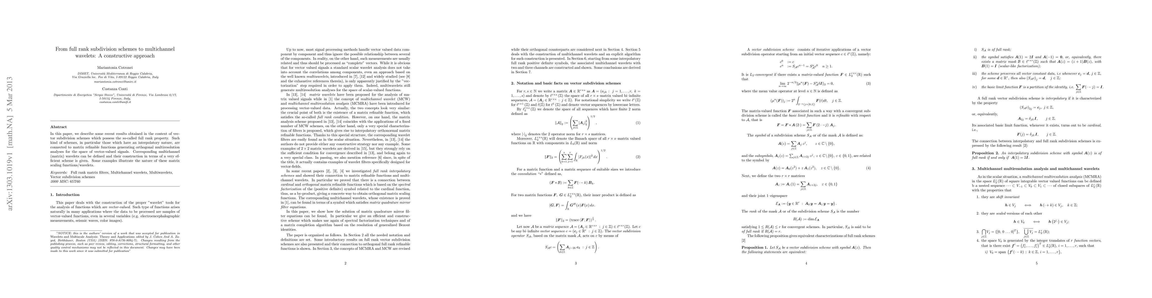 In this paper, we describe some recent results obtained in the context of vector subdivision schemes which possess the so-called full rank property. Such kind of schemes, in particular those which have an interpolatory nature, are connected to matrix refinable functions generating orthogonal multiresolution analyses for the space of vector-valued signals. Corresponding multichannel (matrix) wavelets can be defined and their construction in terms of a very efficient scheme is given. Some examples illustrate the nature of these matrix scaling functions/wavelets.