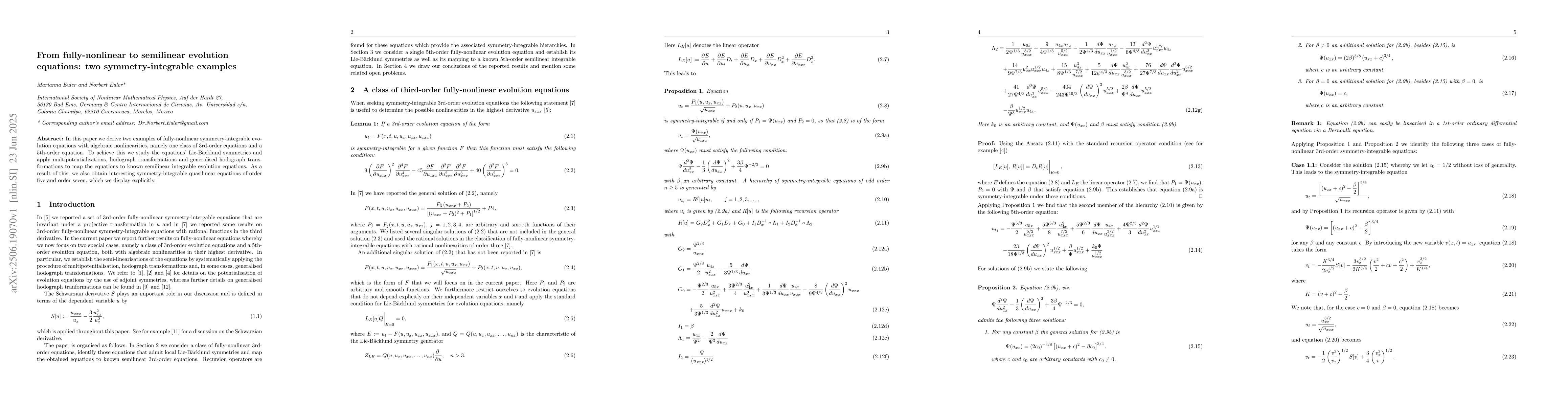 In this paper we derive two examples of fully-nonlinear symmetry-integrable evolution equations with algebraic nonlinearities, namely one class of 3rd-order equations and a 5th-order equation. To achieve this we study the equations' Lie-B\"acklund symmetries and apply multipotentialisations, hodograph transformations and generalised hodograph transformations to map the equations to known semilinear integrable evolution equations. As a result of this, we also obtain interesting symmetry-integrable quasilinear equations of order five and order seven, which we display explicitly.