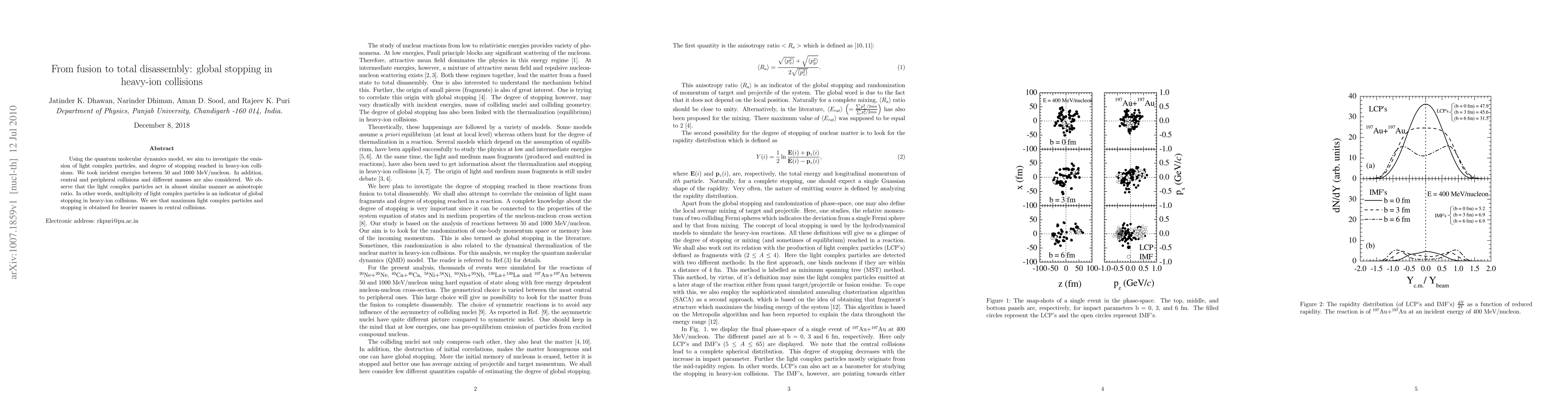 Researchers used a quantum model to study heavy-ion collisions, finding that the emission of light complex particles can indicate global stopping in these collisions. Heavier masses produce more light complex particles and greater stopping power in central collisions.