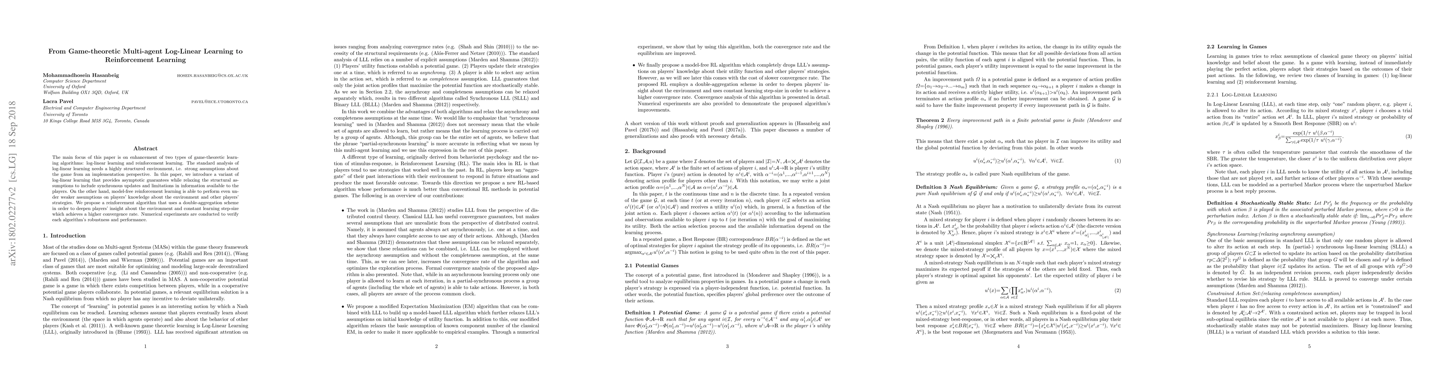 This paper enhances game-theoretic log-linear learning by relaxing structural assumptions and introduces a reinforcement learning algorithm with a double-aggregation scheme for improved convergence. Numerical experiments validate the robustness and performance of both algorithms.