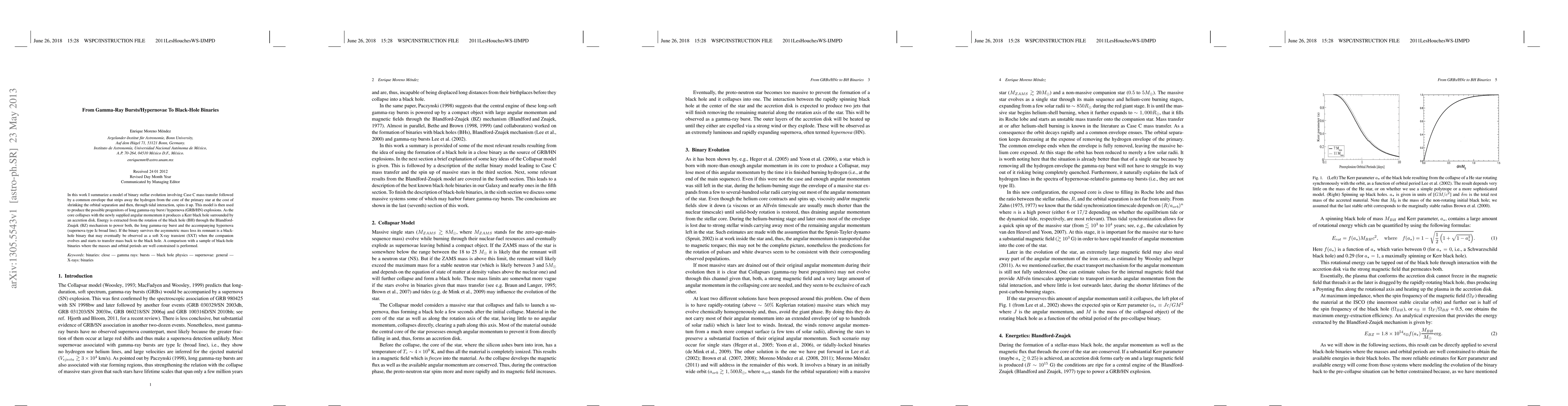 In this work I summarize a model of binary stellar evolution involving Case C mass transfer followed by a common envelope that strips away the hydrogen from the core of the primary star at the cost of shrinking the orbital separation and then, through tidal interaction, spins it up. This model is then used to produce the possible progenitors of long gamma-ray burst / hypernova (GRB/HN) explosions. As the core collapses with the newly supplied angular momentum it produces a Kerr black hole surrounded by an accretion disk. Energy is extracted from the rotation of the black hole (BH) through the Blandford-Znajek (BZ) mechanism to power both, the long gamma-ray burst and the accompanying hypernova (supernova type Ic broad line). If the binary survives the asymmetric mass loss its remnant is a black-hole binary that may eventually be observed as a soft X-ray transient (SXT) when the companion evolves and starts to transfer mass back to the black hole. A comparison with a sample of black-hole binaries where the masses and orbital periods are well constrained is performed.