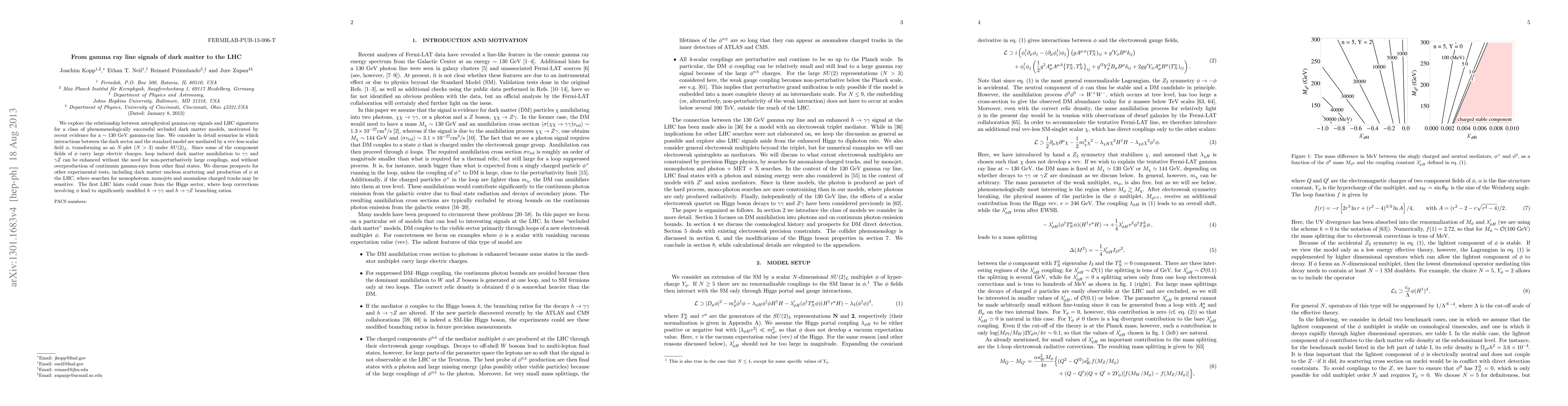 We explore the relationship between astrophysical gamma-ray signals and LHC signatures for a class of phenomenologically successful secluded dark matter models, motivated by recent evidence for a ~130 GeV gamma-ray line. We consider in detail scenarios in which interactions between the dark sector and the standard model are mediated by a vev-less scalar field \phi, transforming as an N-plet (N > 3) under SU(2)_L. Since some of the component fields of \phi carry large electric charges, loop induced dark matter annihilation to \gamma \gamma and \gamma Z can be enhanced without the need for non-perturbatively large couplings, and without overproduction of continuum gamma-rays from other final states. We discuss prospects for other experimental tests, including dark matter-nucleon scattering and production of \phi at the LHC, where future searches for anomalous charged tracks may be sensitive. The first LHC hints could come from the Higgs sector, where loop corrections involving \phi lead to significantly modified h to \gamma \gamma and h to \gamma Z branching ratios.
