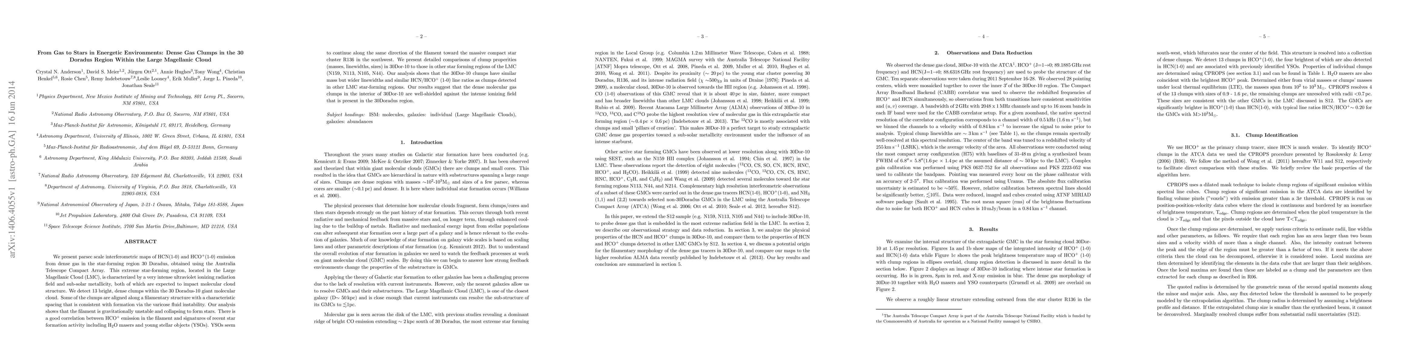 This paper presents interferometric maps of HCN and HCO+ emissions in the star-forming region 30 Doradus in the LMC, revealing 13 dense gas clumps. The clumps show signs of gravitational instability and star formation, correlating with recent star formation activity and aligned along a filamentary structure.