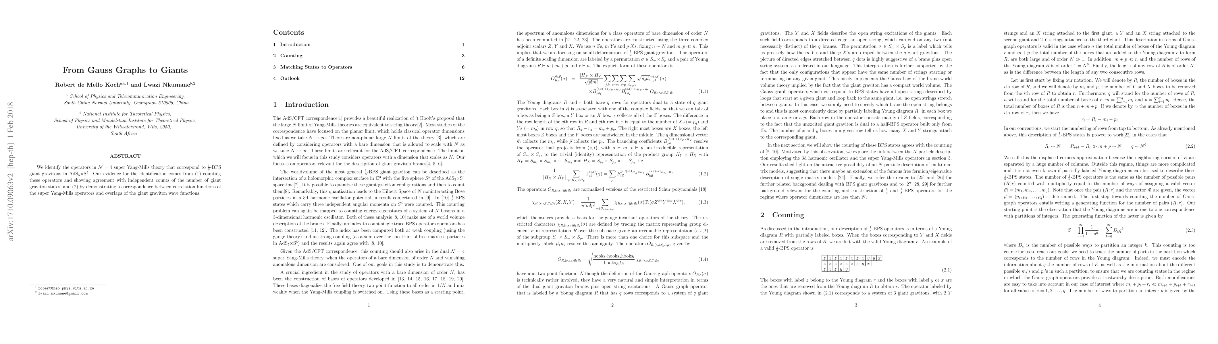 We identify the operators in ${\cal N}=4$ super Yang-Mills theory that correspond to ${1\over 8}$-BPS giant gravitons in AdS$_5\times$S$^5$. Our evidence for the identification comes from (1) counting these operators and showing agreement with independent counts of the number of giant graviton states, and (2) by demonstrating a correspondence between correlation functions of the super Yang-Mills operators and overlaps of the giant graviton wave functions.