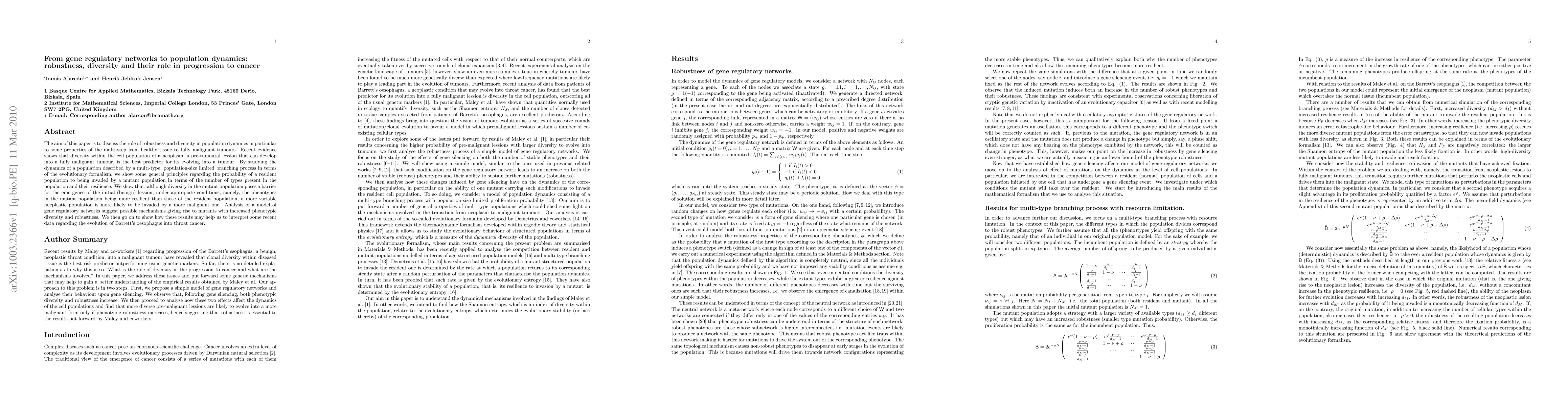 The aim of this paper is to discuss the role of robustness and diversity in population dynamics in particular to some properties of the multi-step from healthy tissue to fully malignant tumours. Recent evidence shows that diversity within the cell population of a neoplasm, a pre-tumoural lession that can develop into a fully malignant tumour, is the best predictor for its evolving into a tumour. By studying the dynamics of a population described by a multi-type, population-size limited branching process in terms of the evolutionary formalism, we show some general principles regarding the probability of a resident population to being invaded by a mutant population in terms of the number of types present in the population and their resilience. We show that, although diversity in the mutant population poses a barrier for the emergence of the initial (benign) lession, under appropiate conditions, namely, the phenotypes in the mutant population being more resilient than those of the resident population, a more variable noeplastic population is more likely to be invaded by a more malignant one. Analysis of a model of gene regulatory networks suggest possible mechanisms giving rise to mutants with increased phenotypic diversity and robustness. We then go on to show how these results may help us to interpret some recent data regarding the evolution of Barrett's oesophagus into throat cancer.