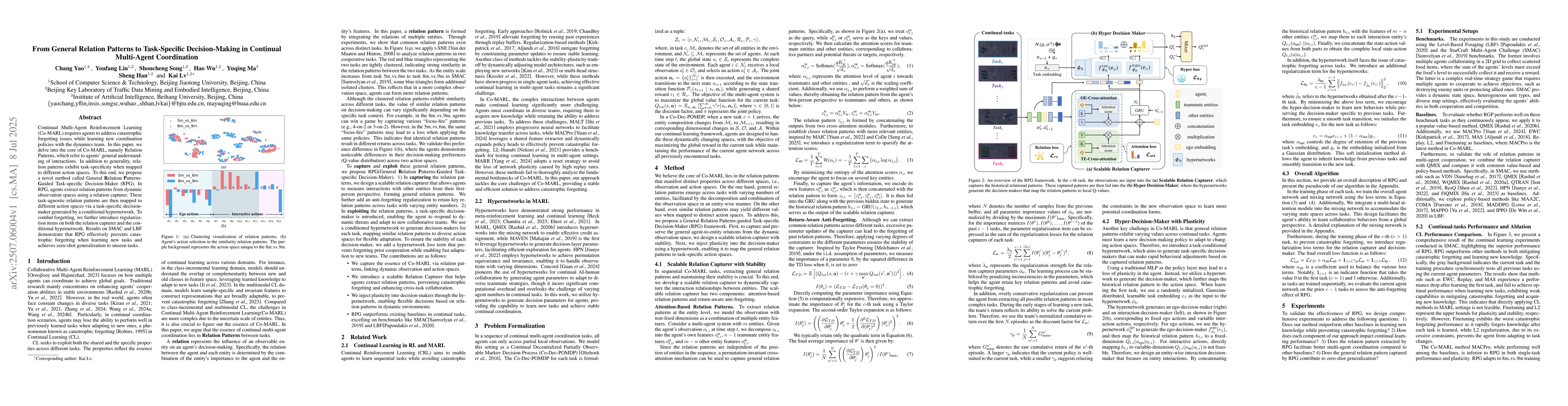 Continual Multi-Agent Reinforcement Learning (Co-MARL) requires agents to address catastrophic forgetting issues while learning new coordination policies with the dynamics team. In this paper, we delve into the core of Co-MARL, namely Relation Patterns, which refer to agents' general understanding of interactions. In addition to generality, relation patterns exhibit task-specificity when mapped to different action spaces. To this end, we propose a novel method called General Relation Patterns-Guided Task-Specific Decision-Maker (RPG). In RPG, agents extract relation patterns from dynamic observation spaces using a relation capturer. These task-agnostic relation patterns are then mapped to different action spaces via a task-specific decision-maker generated by a conditional hypernetwork. To combat forgetting, we further introduce regularization items on both the relation capturer and the conditional hypernetwork. Results on SMAC and LBF demonstrate that RPG effectively prevents catastrophic forgetting when learning new tasks and achieves zero-shot generalization to unseen tasks.