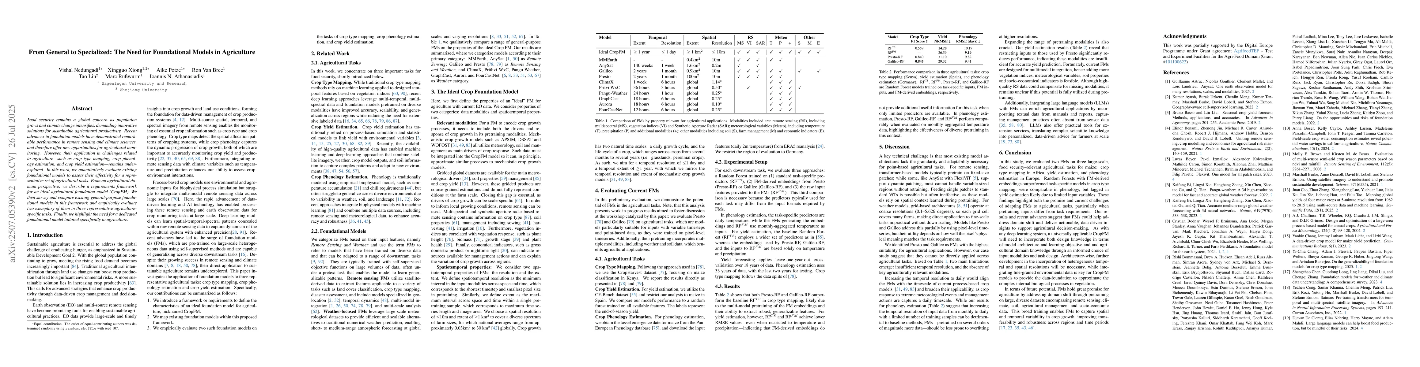 The paper discusses the potential of foundation models in addressing agricultural challenges, emphasizing the need for a specialized model, CropFM. It evaluates existing models for tasks like crop type mapping and yield estimation, concluding that tailored agricultural foundation models are necessary for improved performance.