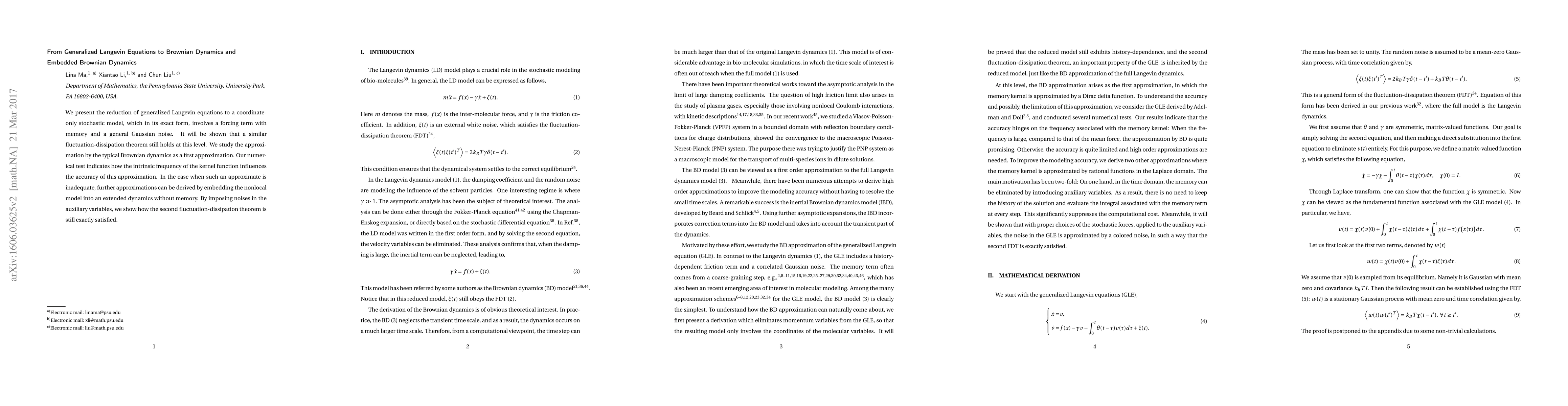 Researchers reduce generalized Langevin equations to a simpler model, showing that it still follows fluctuation-dissipation theorems and can be approximated with Brownian dynamics, with accuracy influenced by the kernel function's frequency.
