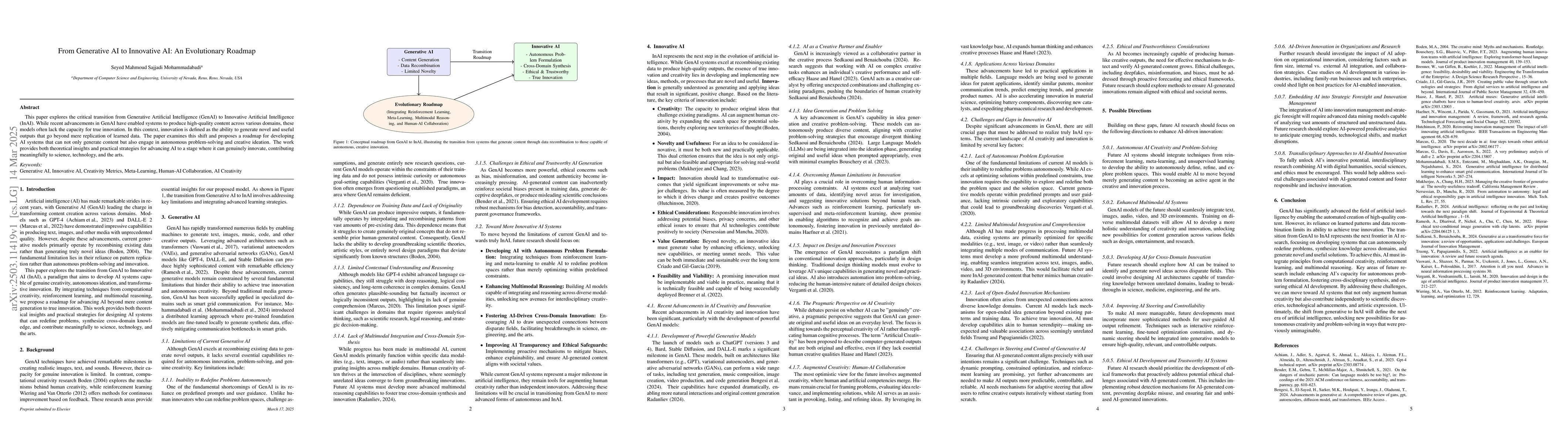 This work stands out by explicitly addressing the gap between current GenAI capabilities and the need for AI systems capable of true innovation, proposing a detailed roadmap for this transition.