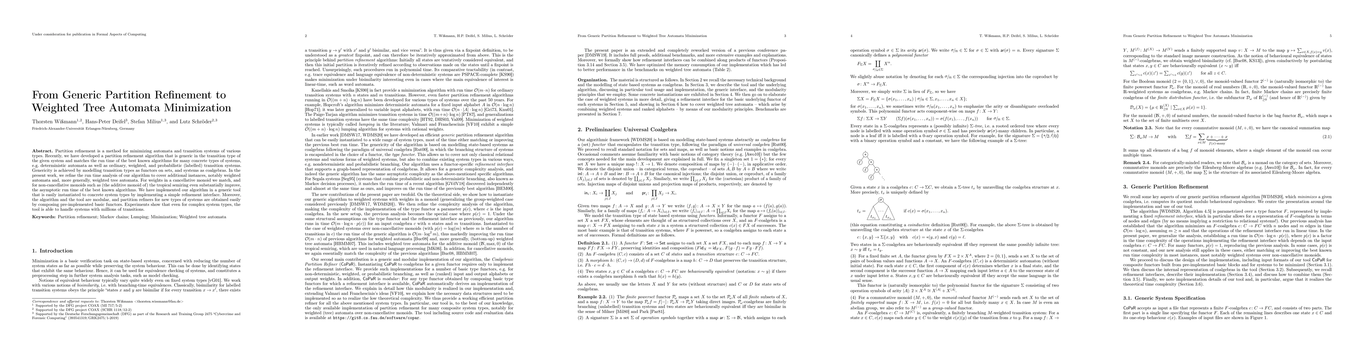 Partition refinement is a method for minimizing automata and transition systems of various types. Recently, we have developed a partition refinement algorithm that is generic in the transition type of the given system and matches the run time of the best known algorithms for many concrete types of systems, e.g. deterministic automata as well as ordinary, weighted, and probabilistic (labelled) transition systems. Genericity is achieved by modelling transition types as functors on sets, and systems as coalgebras. In the present work, we refine the run time analysis of our algorithm to cover additional instances, notably weighted automata and, more generally, weighted tree automata. For weights in a cancellative monoid we match, and for non-cancellative monoids such as (the additive monoid of) the tropical semiring even substantially improve, the asymptotic run time of the best known algorithms. We have implemented our algorithm in a generic tool that is easily instantiated to concrete system types by implementing a simple refinement interface. Moreover, the algorithm and the tool are modular, and partition refiners for new types of systems are obtained easily by composing pre-implemented basic functors. Experiments show that even for complex system types, the tool is able to handle systems with millions of transitions.