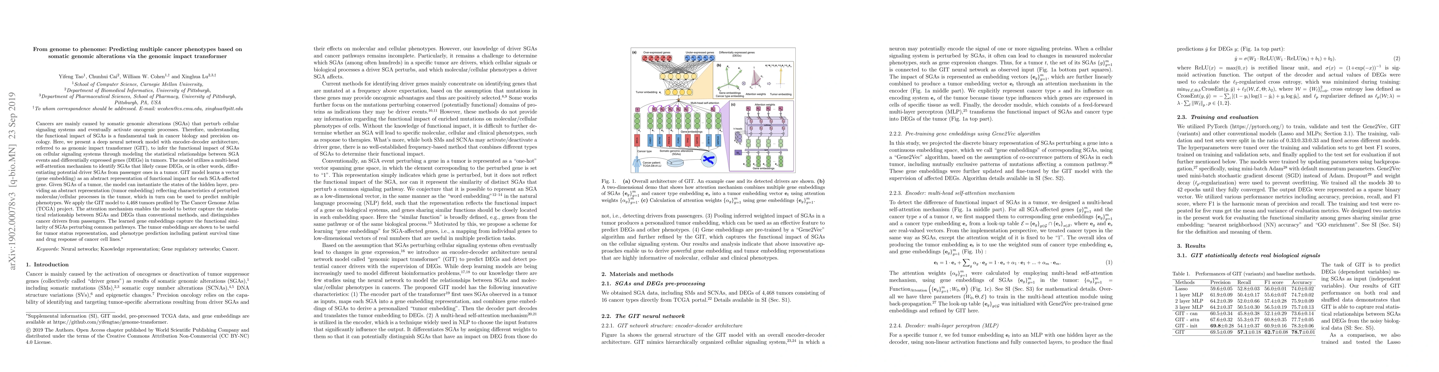 Cancers are mainly caused by somatic genomic alterations (SGAs) that perturb cellular signaling systems and eventually activate oncogenic processes. Therefore, understanding the functional impact of SGAs is a fundamental task in cancer biology and precision oncology. Here, we present a deep neural network model with encoder-decoder architecture, referred to as genomic impact transformer (GIT), to infer the functional impact of SGAs on cellular signaling systems through modeling the statistical relationships between SGA events and differentially expressed genes (DEGs) in tumors. The model utilizes a multi-head self-attention mechanism to identify SGAs that likely cause DEGs, or in other words, differentiating potential driver SGAs from passenger ones in a tumor. GIT model learns a vector (gene embedding) as an abstract representation of functional impact for each SGA-affected gene. Given SGAs of a tumor, the model can instantiate the states of the hidden layer, providing an abstract representation (tumor embedding) reflecting characteristics of perturbed molecular/cellular processes in the tumor, which in turn can be used to predict multiple phenotypes. We apply the GIT model to 4,468 tumors profiled by The Cancer Genome Atlas (TCGA) project. The attention mechanism enables the model to better capture the statistical relationship between SGAs and DEGs than conventional methods, and distinguishes cancer drivers from passengers. The learned gene embeddings capture the functional similarity of SGAs perturbing common pathways. The tumor embeddings are shown to be useful for tumor status representation, and phenotype prediction including patient survival time and drug response of cancer cell lines.