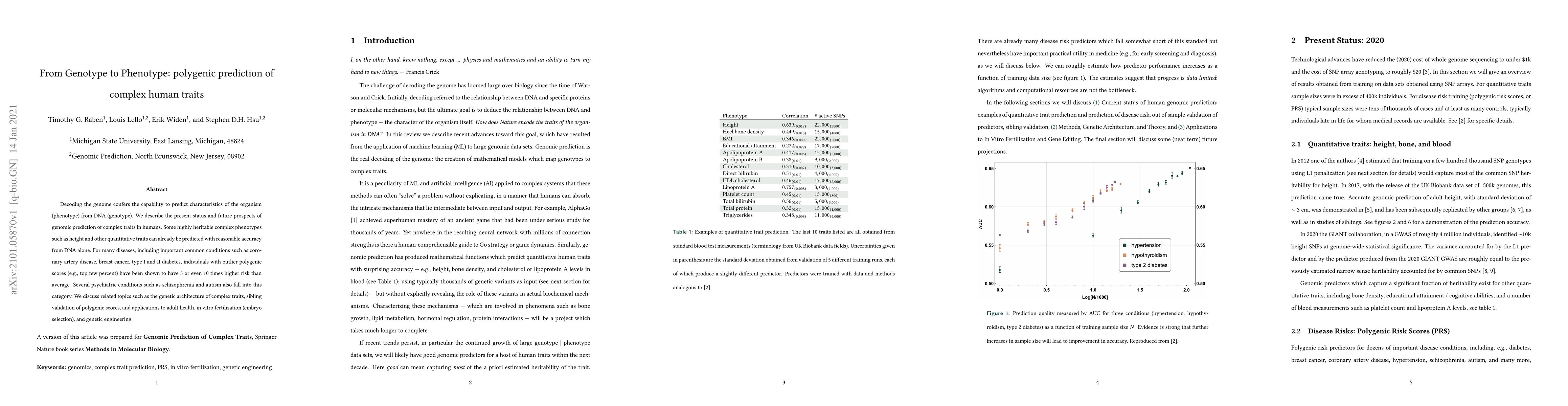 This paper explores the current state and future potential of genomic prediction for complex human traits, highlighting the ability to predict traits like height and disease risks from DNA. It emphasizes the significant heritability of traits and the potential for polygenic scores to identify individuals at high risk for conditions such as coronary artery disease and psychiatric disorders.