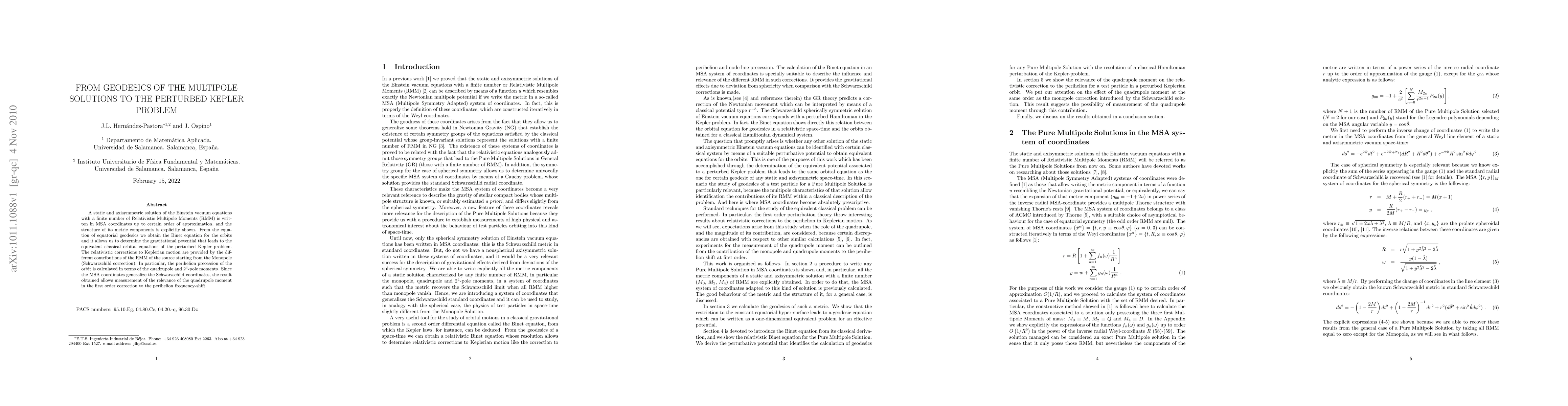 A static and axisymmetric solution of the Einstein vacuum equations with a finite number of Relativistic Multipole Moments (RMM) is written in MSA coordinates up to certain order of approximation, and the structure of its metric components is explicitly shown. From the equation of equatorial geodesics we obtain the Binet equation for the orbits and it allows us to determine the gravitational potential that leads to the equivalent classical orbital equations of the perturbed Kepler problem. The relativistic corrections to Keplerian motion are provided by the different contributions of the RMM of the source starting from the Monopole (Schwarzschild correction). In particular, the perihelion precession of the orbit is calculated in terms of the quadrupole and 2$^4$-pole moments. Since the MSA coordinates generalize the Schwarzschild coordinates, the result obtained allows measurement of the relevance of the quadrupole moment in the first order correction to the perihelion frequency-shift.