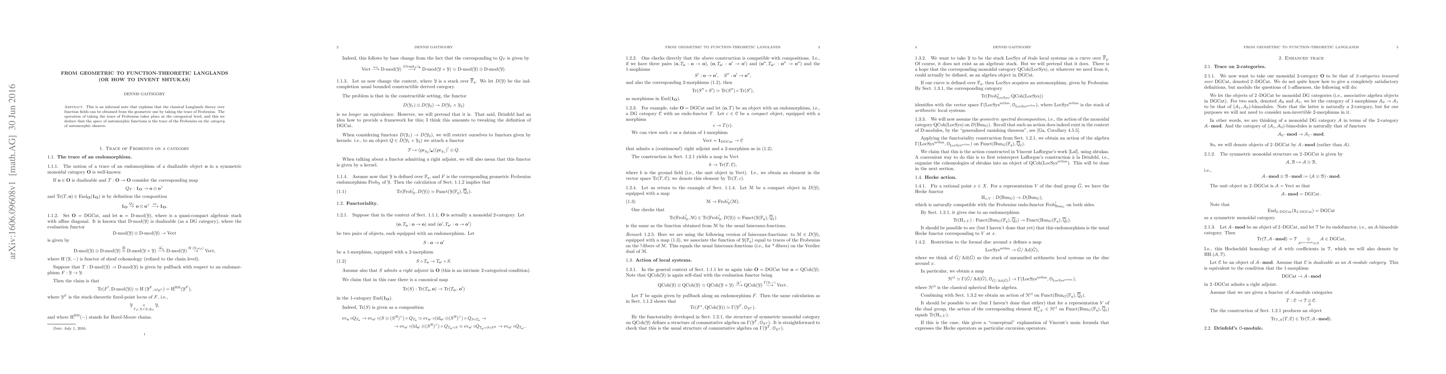 This is an informal note that explains that the classical Langlands theory over function fields can be obtained from the geometric one by taking the trace of Frobenius. The operation of taking the trace of Frobenius takes place at the categorical level, and this we deduce that the space of automorphic functions is the trace of the Frobenius on the category of automorphic sheaves.