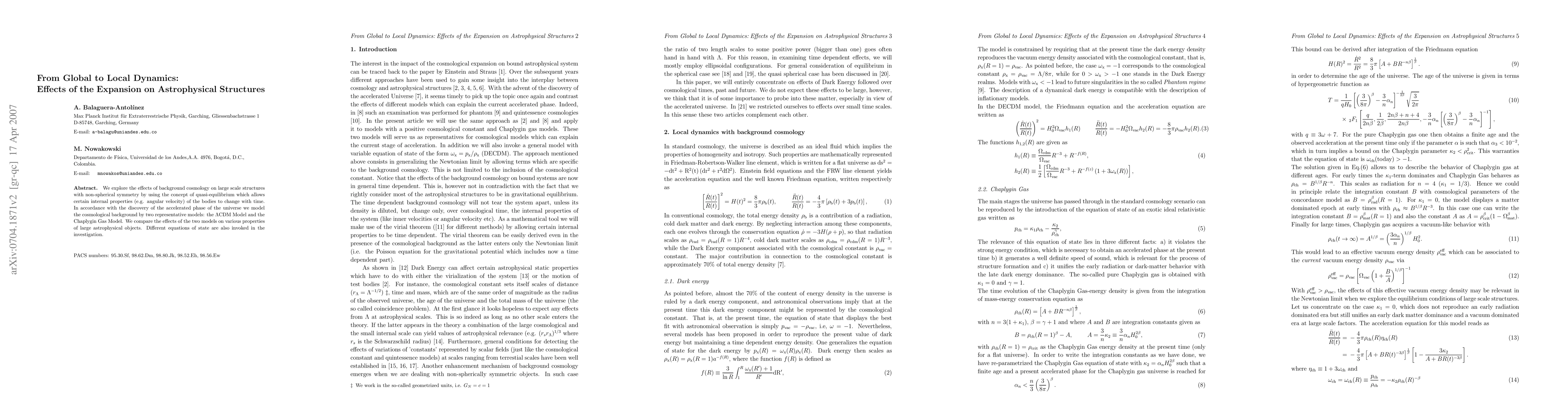 We explore the effects of background cosmology on large scale structures with non-spherical symmetry by using the concept of quasi-equilibrium which allows certain internal properties (e.g. angular velocity) of the bodies to change with time. In accordance with the discovery of the accelerated phase of the universe we model the cosmological background by two representative models: the $\Lambda$CDM Model and the Chaplygin Gas Model. We compare the effects of the two models on various properties of large astrophysical objects. Different equations of state are also invoked in the investigation.