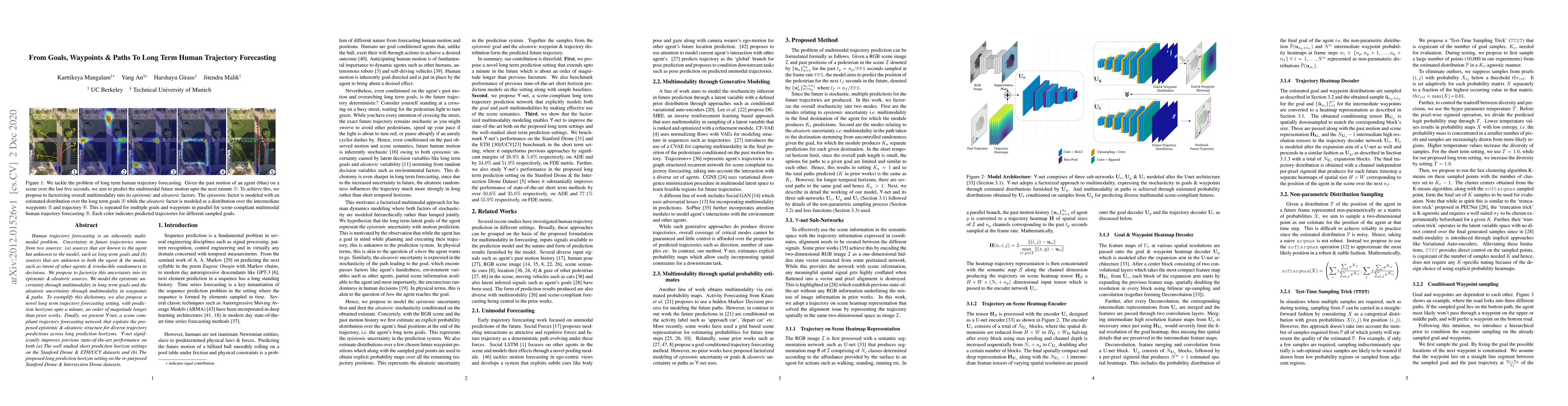 Human trajectory forecasting is an inherently multi-modal problem. Uncertainty in future trajectories stems from two sources: (a) sources that are known to the agent but unknown to the model, such as long term goals and (b)sources that are unknown to both the agent & the model, such as intent of other agents & irreducible randomness indecisions. We propose to factorize this uncertainty into its epistemic & aleatoric sources. We model the epistemic un-certainty through multimodality in long term goals and the aleatoric uncertainty through multimodality in waypoints& paths. To exemplify this dichotomy, we also propose a novel long term trajectory forecasting setting, with prediction horizons upto a minute, an order of magnitude longer than prior works. Finally, we presentY-net, a scene com-pliant trajectory forecasting network that exploits the pro-posed epistemic & aleatoric structure for diverse trajectory predictions across long prediction horizons.Y-net significantly improves previous state-of-the-art performance on both (a) The well studied short prediction horizon settings on the Stanford Drone & ETH/UCY datasets and (b) The proposed long prediction horizon setting on the re-purposed Stanford Drone & Intersection Drone datasets.
