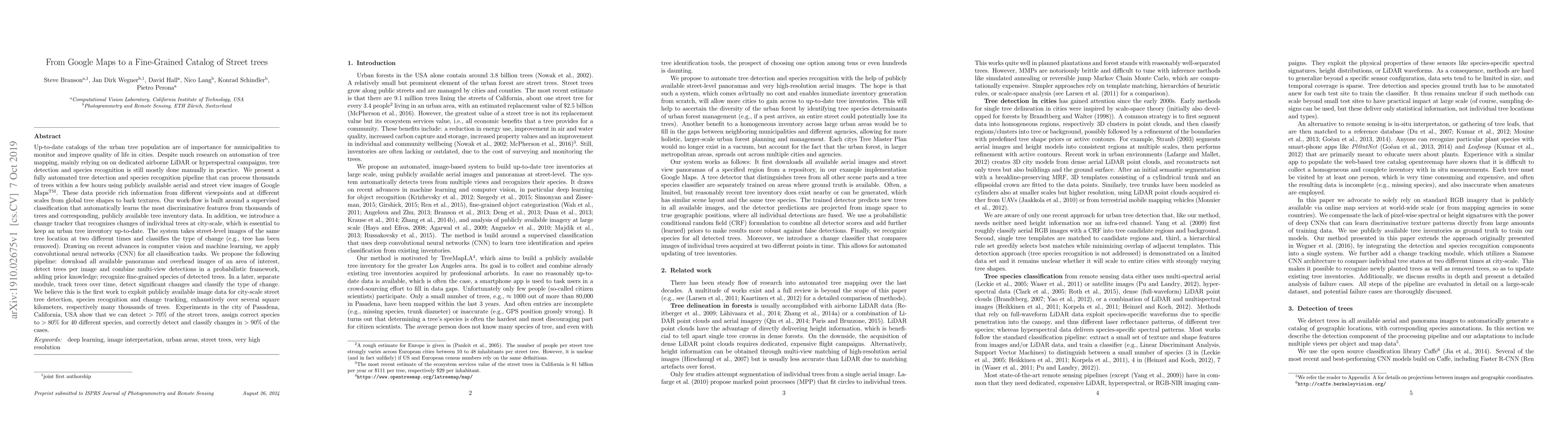 This paper presents a fully automated pipeline for detecting and classifying urban street trees using publicly available Google Maps images, employing convolutional neural networks for species recognition and a change tracker to update inventories. Experiments in Pasadena, California, demonstrate high accuracy in tree detection, species assignment, and change identification.