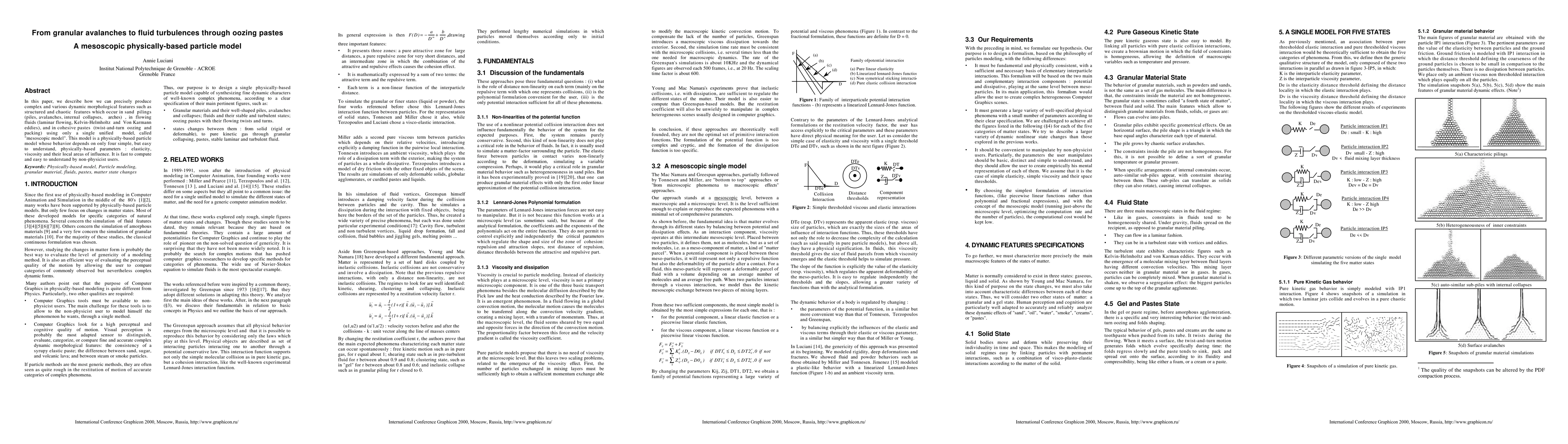 In this paper, we describe how we can precisely produce complex and various dynamic morphological features such as structured and chaotic features which occur in sand pilings (piles, avalanches, internal collapses, arches) , in flowing fluids (laminar flowing, Kelvin-Helmholtz and Von Karmann eddies), and in cohesive pastes (twist-and-turn oozing and packing) using only a single unified model, called "mesoscopic model". This model is a physically-based particle model whose behavior depends on only four simple, but easy to understand, physically-based parameters : elasticity, viscosity and their local areas of influence. It is fast to compute and easy to understand by non-physicist users.