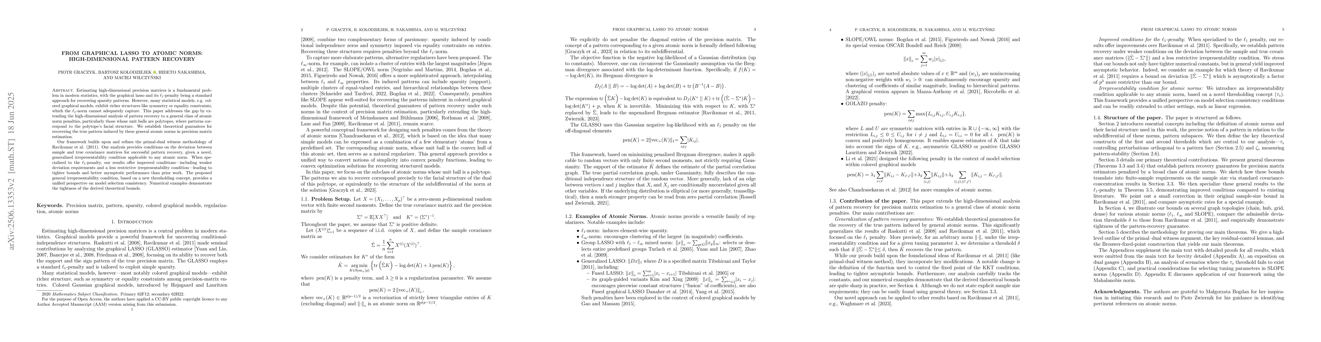 Estimating high-dimensional precision matrices is a fundamental problem in modern statistics, with the graphical lasso and its $\ell_1$-penalty being a standard approach for recovering sparsity patterns. However, many statistical models, e.g. colored graphical models, exhibit richer structures like symmetry or equality constraints, which the $\ell_1$-norm cannot adequately capture. This paper addresses the gap by extending the high-dimensional analysis of pattern recovery to a general class of atomic norm penalties, particularly those whose unit balls are polytopes, where patterns correspond to the polytope's facial structure. We establish theoretical guarantees for recovering the true pattern induced by these general atomic norms in precision matrix estimation. Our framework builds upon and refines the primal-dual witness methodology of Ravikumar et al. (2011). Our analysis provides conditions on the deviation between sample and true covariance matrices for successful pattern recovery, given a novel, generalized irrepresentability condition applicable to any atomic norm. When specialized to the $\ell_1$-penalty, our results offer improved conditions -- including weaker deviation requirements and a less restrictive irrepresentability condition -- leading to tighter bounds and better asymptotic performance than prior work. The proposed general irrepresentability condition, based on a new thresholding concept, provides a unified perspective on model selection consistency. Numerical examples demonstrate the tightness of the derived theoretical bounds.